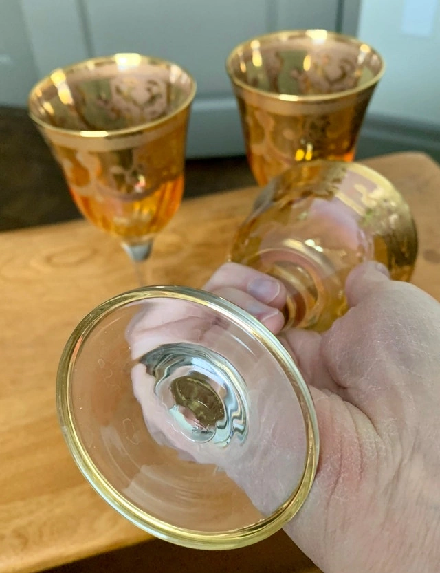 Add a touch of vintage elegance to your table with these stunning J Preziosi amber glass goblets, each adorned with a delicate 24K gold overlay. These used goblets feature a beautiful amber hue that catches the light, making them perfect for special occasions or adding a luxurious feel to everyday dining. Elegant amber colour, 24K gold overlay design. Perfect for adding a vintage touch to your dining experience. If the ad is up, they're available!
