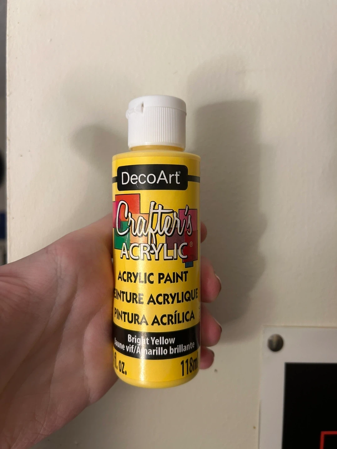 This is a bottle of DecoArt Crafter's Acrylic Paint in Bright Yellow. It's a 118ml bottle of acrylic paint. Perfect for your next craft project!