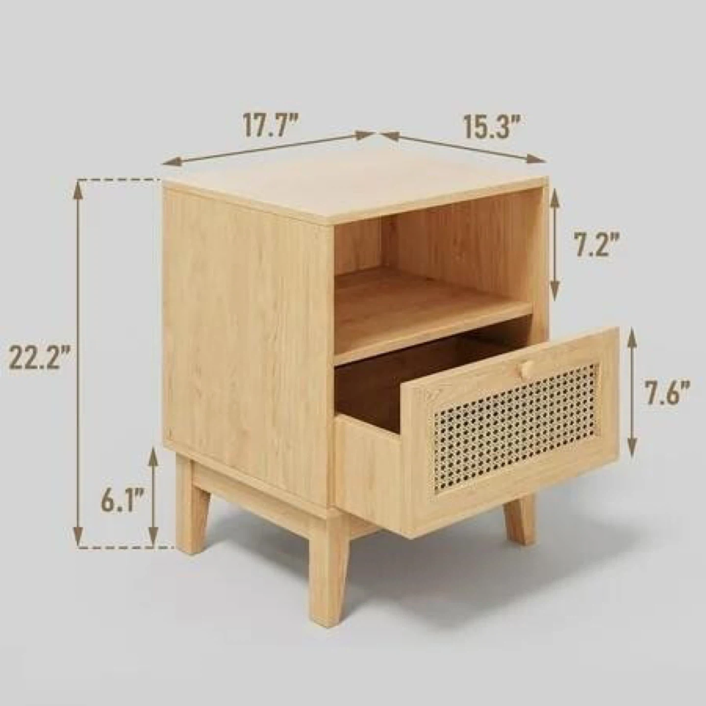A lovely wooden nightstand featuring an open shelf and a drawer with a woven cane front. It's made of wood with a light oak finish and has a natural rattan drawer face. This piece is perfect for adding a touch of boho-chic to your bedroom!