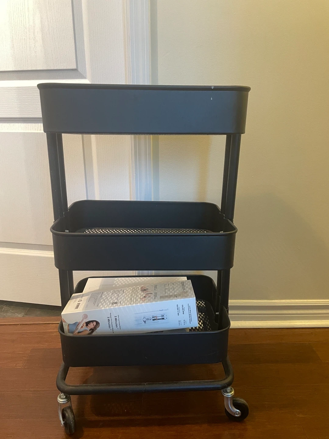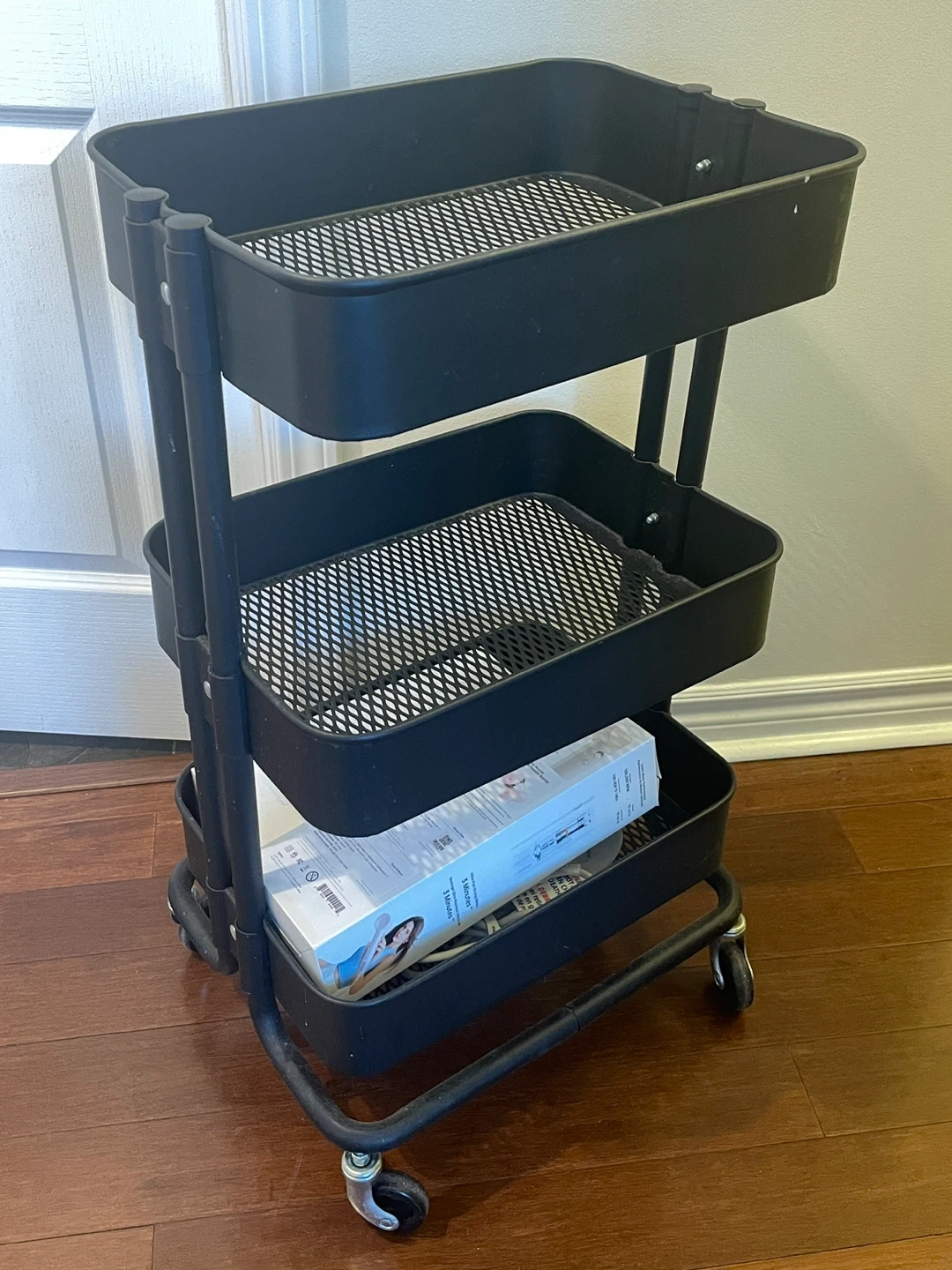 A 3-tier rolling utility cart in black. It has a metal construction and wheels for easy movement. The shelves are perforated.