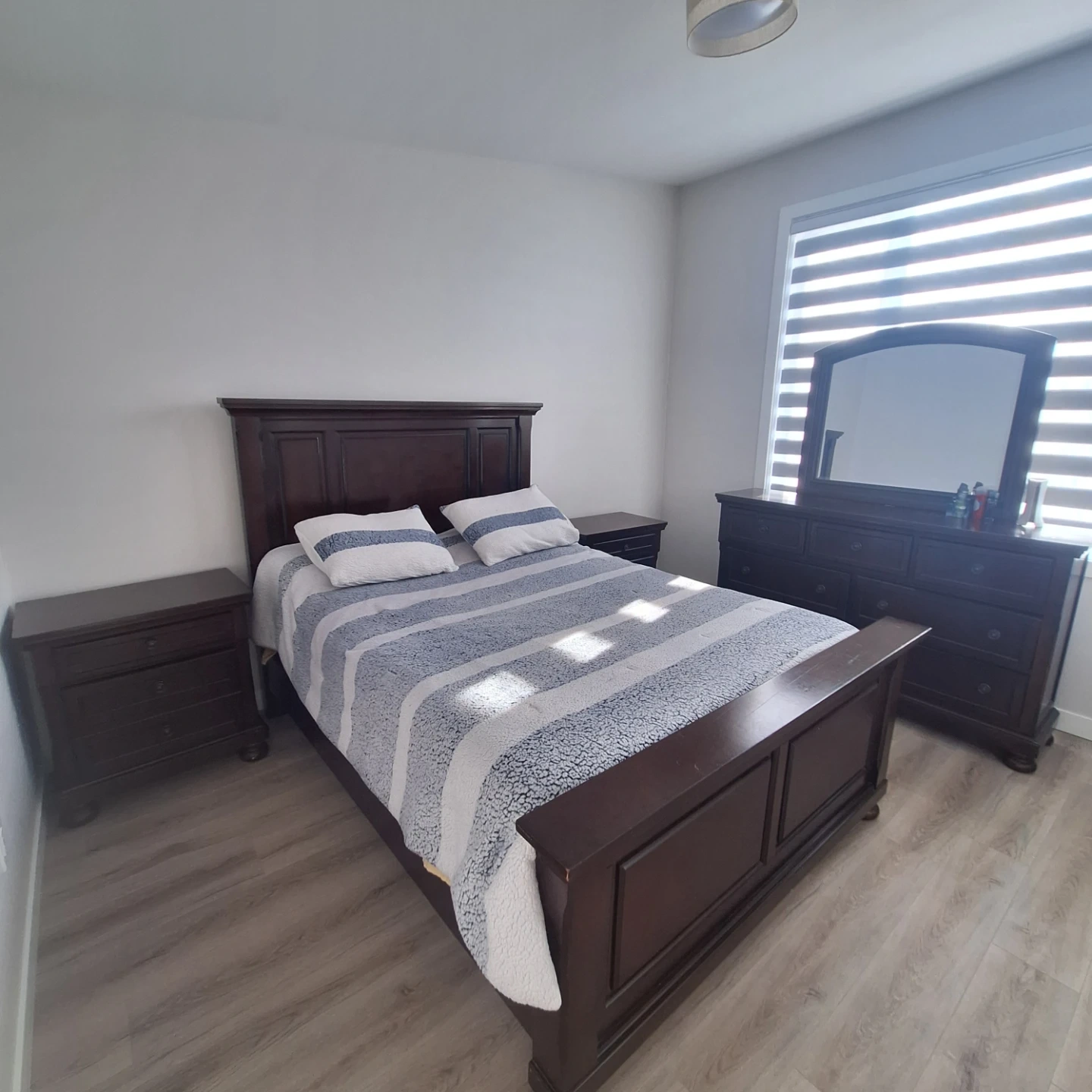 This is a dark wood bedroom furniture set including a bed frame, a dresser with a mirror, and two nightstands. The bed frame has a classic, sturdy design. The dresser offers ample drawer space and comes with an attached mirror. Two matching nightstands complete the set, providing convenient bedside storage. The wood finish is a deep, rich tone.