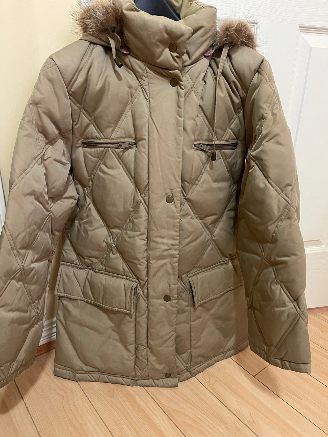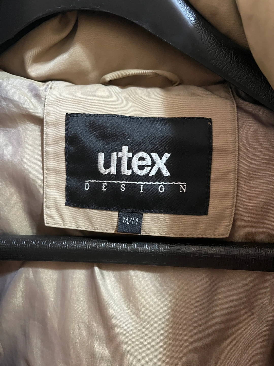 This Utex Design parka is a stylish and warm quilted jacket. It features a detachable fur-trimmed hood and multiple pockets. The size is M/M. Long 34”, shoulder 18”, sleeve 24”.