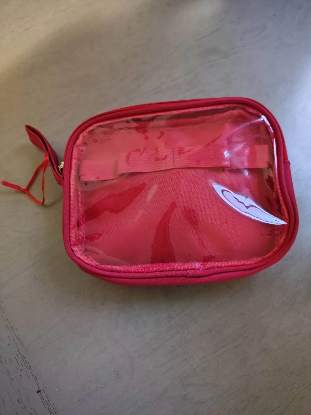 This red zippered pouch features a clear window on top for easy visibility of contents. It's great for organizing small items like toiletries or makeup. Zipper closure keeps everything secure.