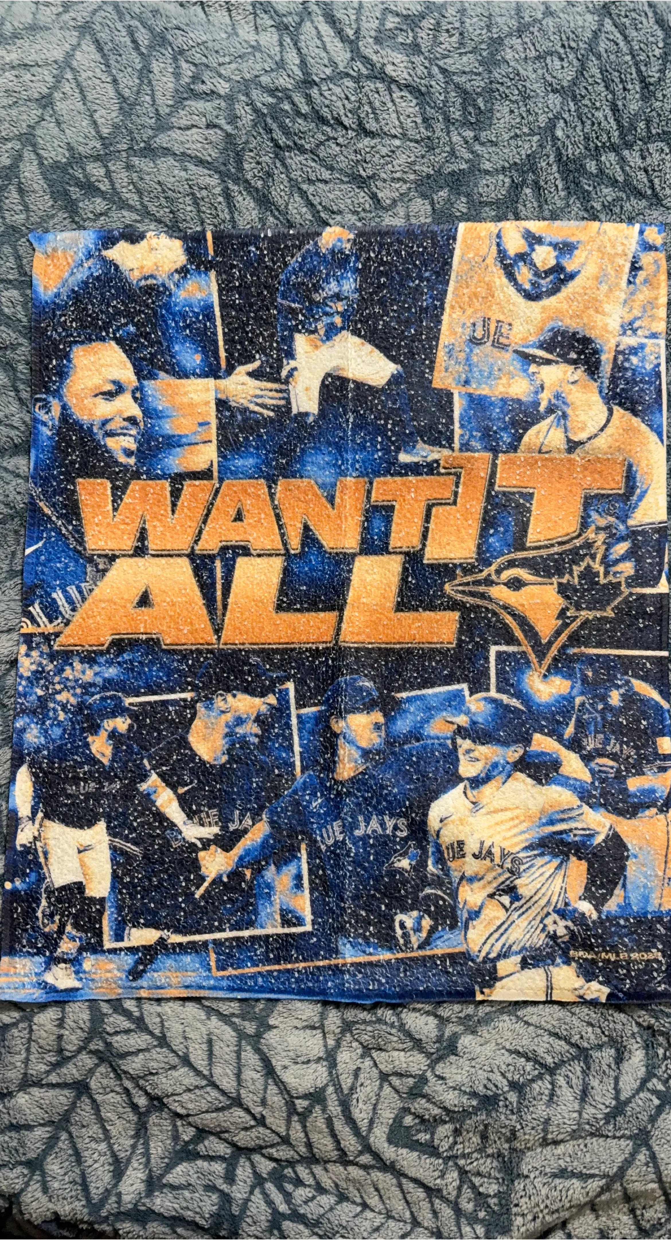 Toronto Blue Jays "Want It All" towel featuring player images. It's a great way to show your team spirit! This towel is perfect for any baseball fan.