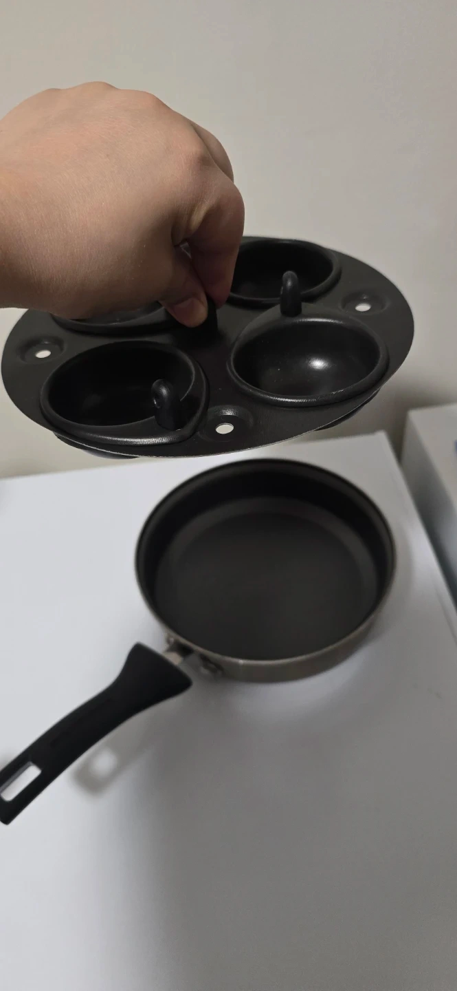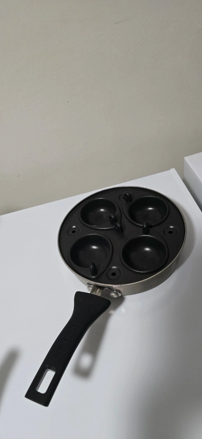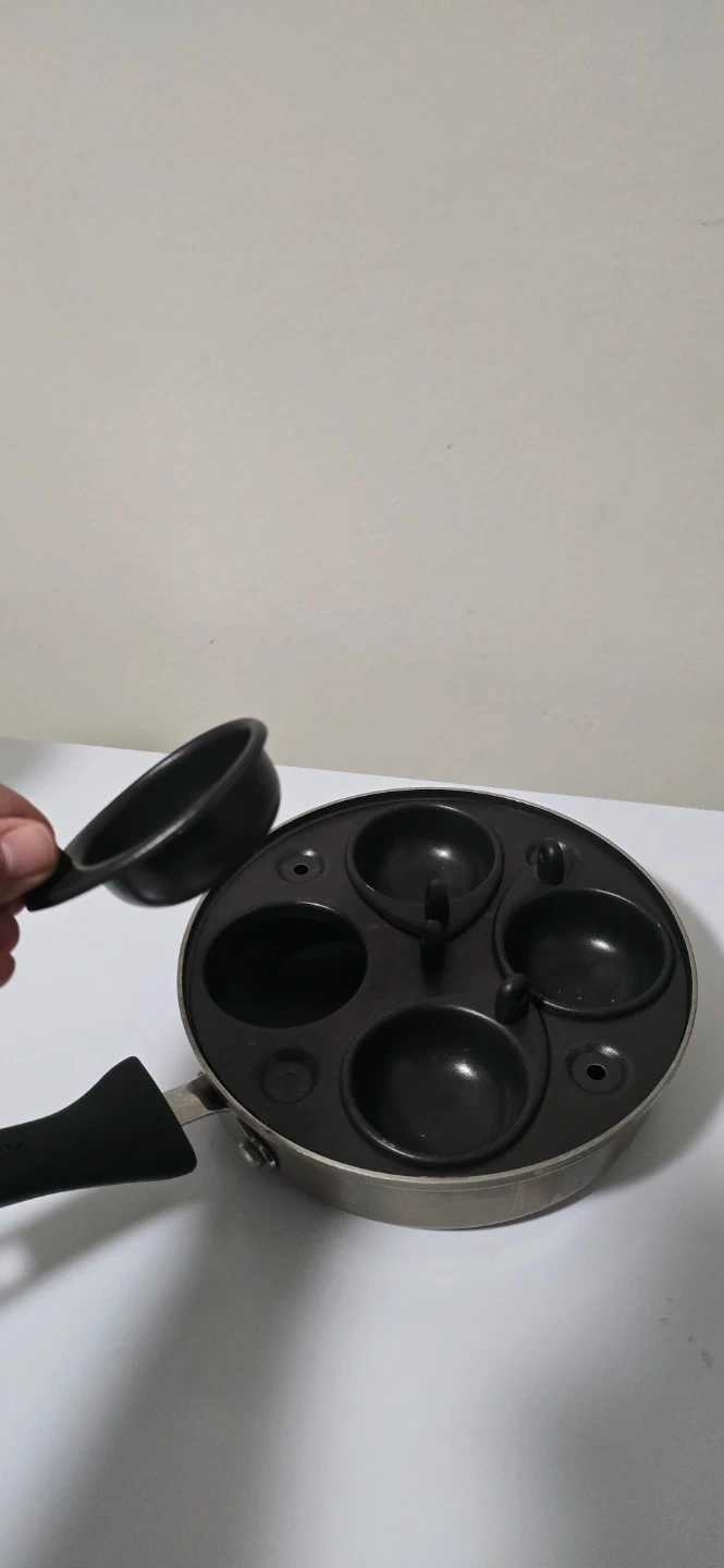 This is a four-cup egg poacher pan. It's made of metal with a black non-stick coating. Includes a lid insert for poaching.