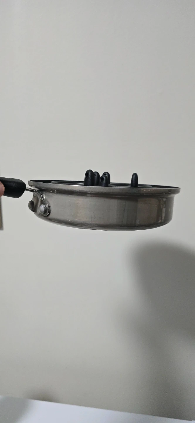 This is a four-cup egg poacher pan. It's made of metal with a black non-stick coating. Includes a lid insert for poaching.