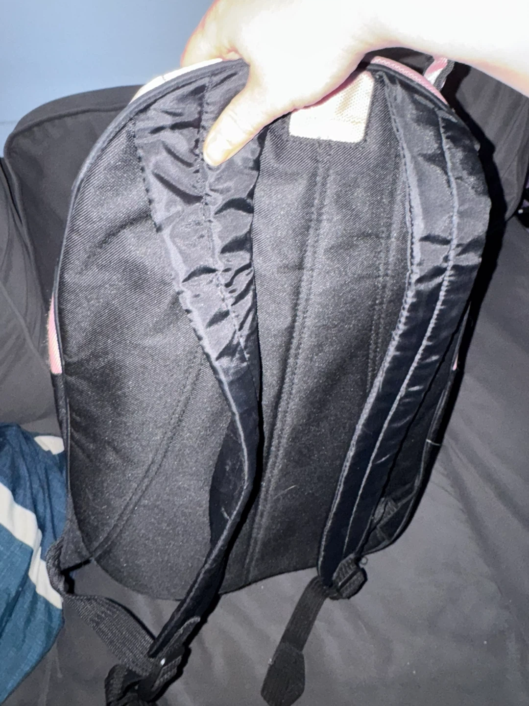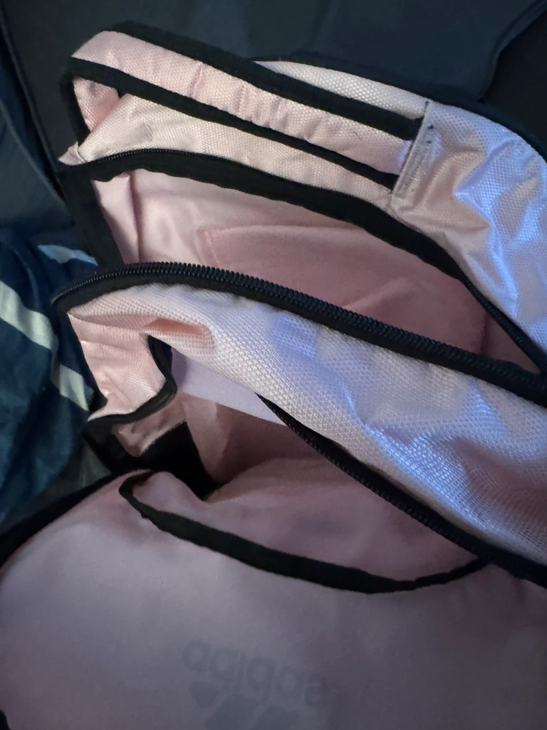 Pink and black Adidas backpack with white stripes. It features multiple zippered compartments. This bag's adjustable straps make it comfy to wear.