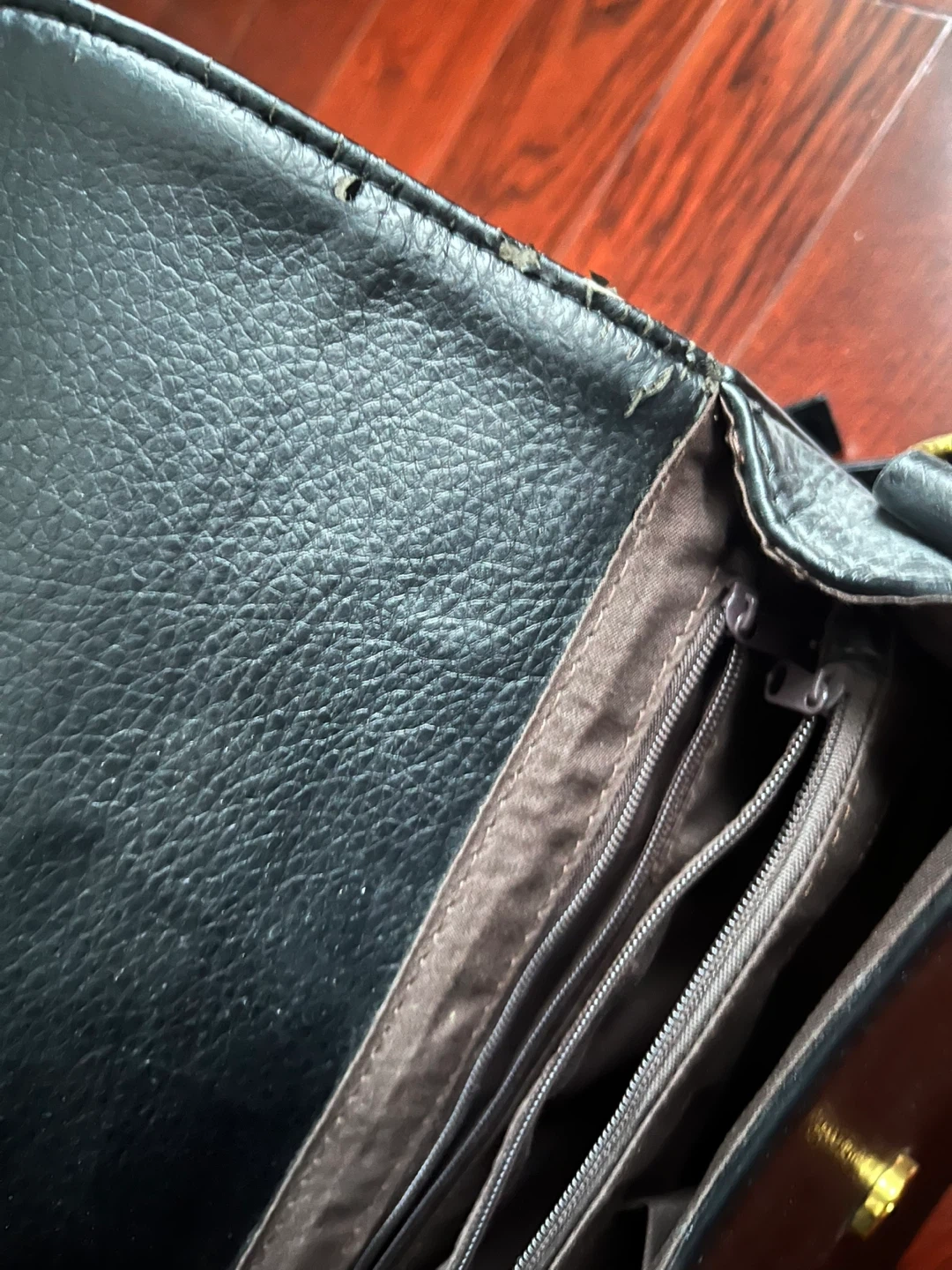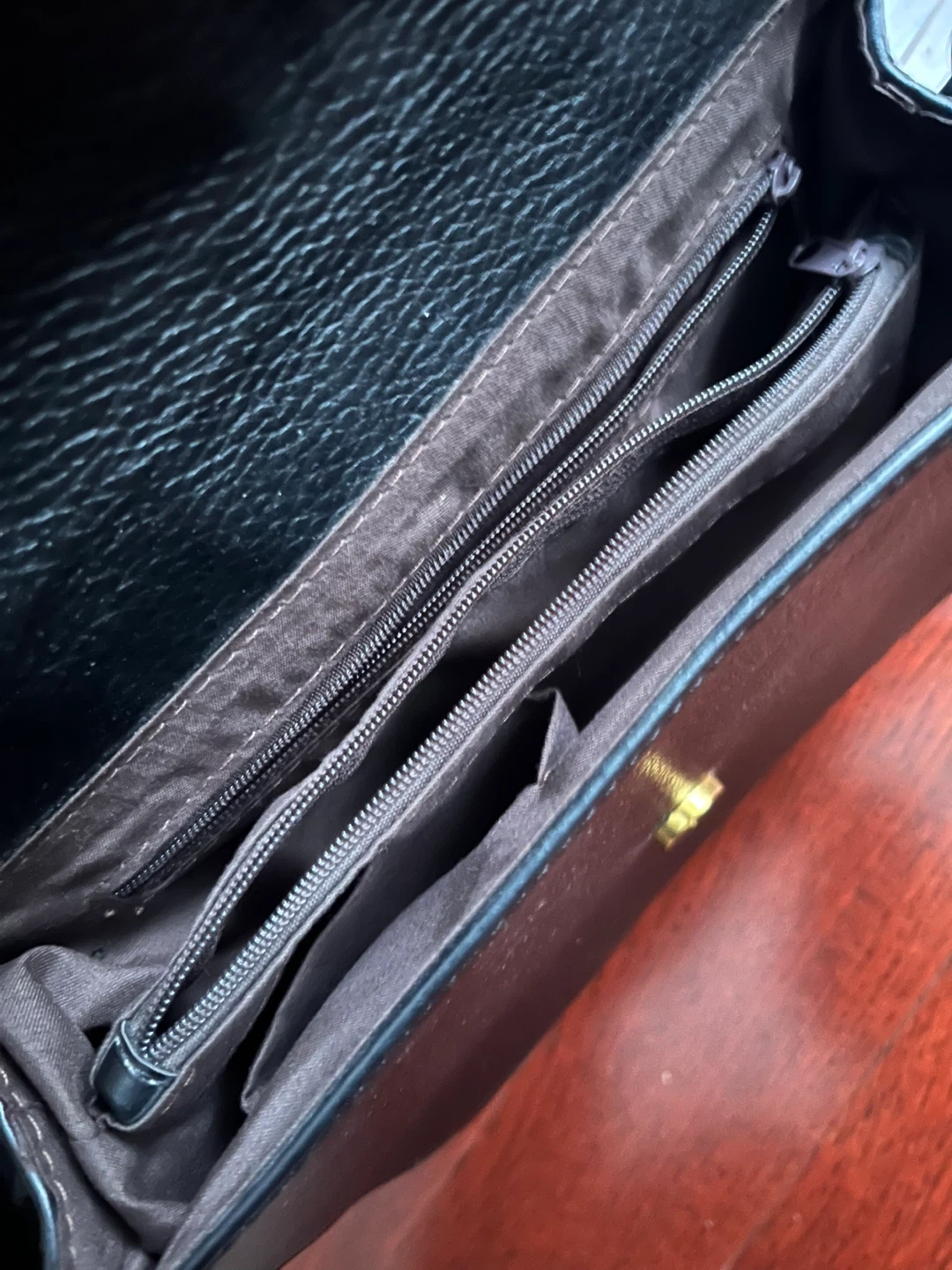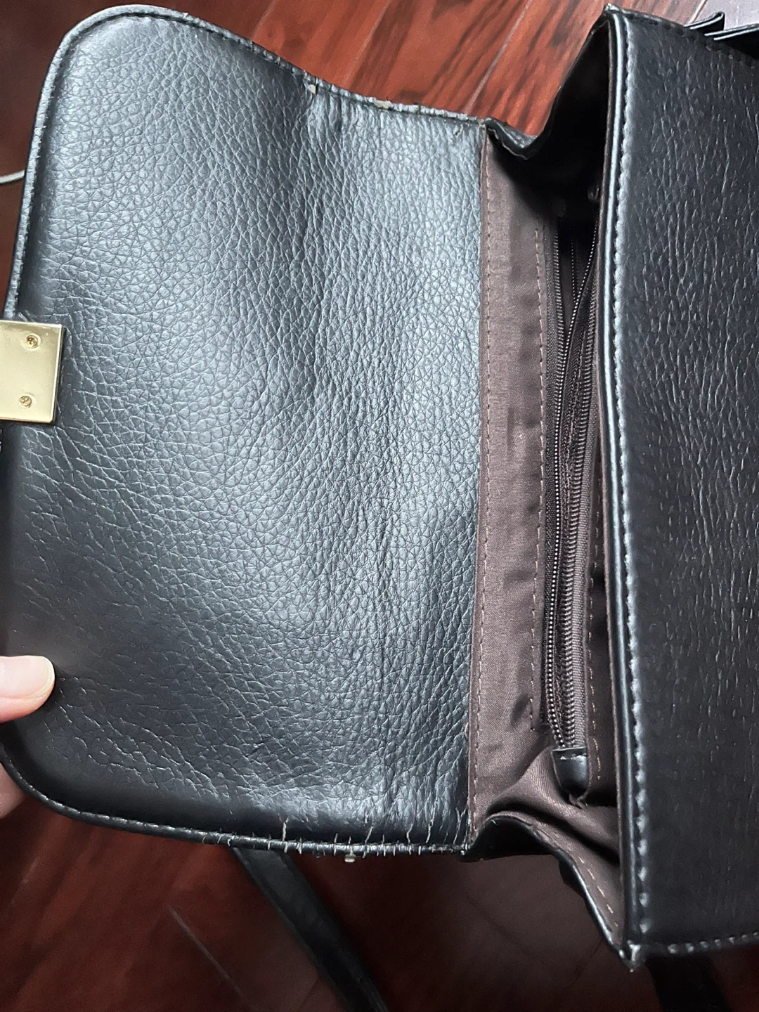 This is a black shoulder bag made from faux leather. It has a main compartment with a zippered pocket and two smaller interior pockets. It's a versatile accessory for everyday use.