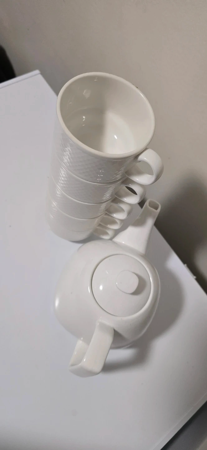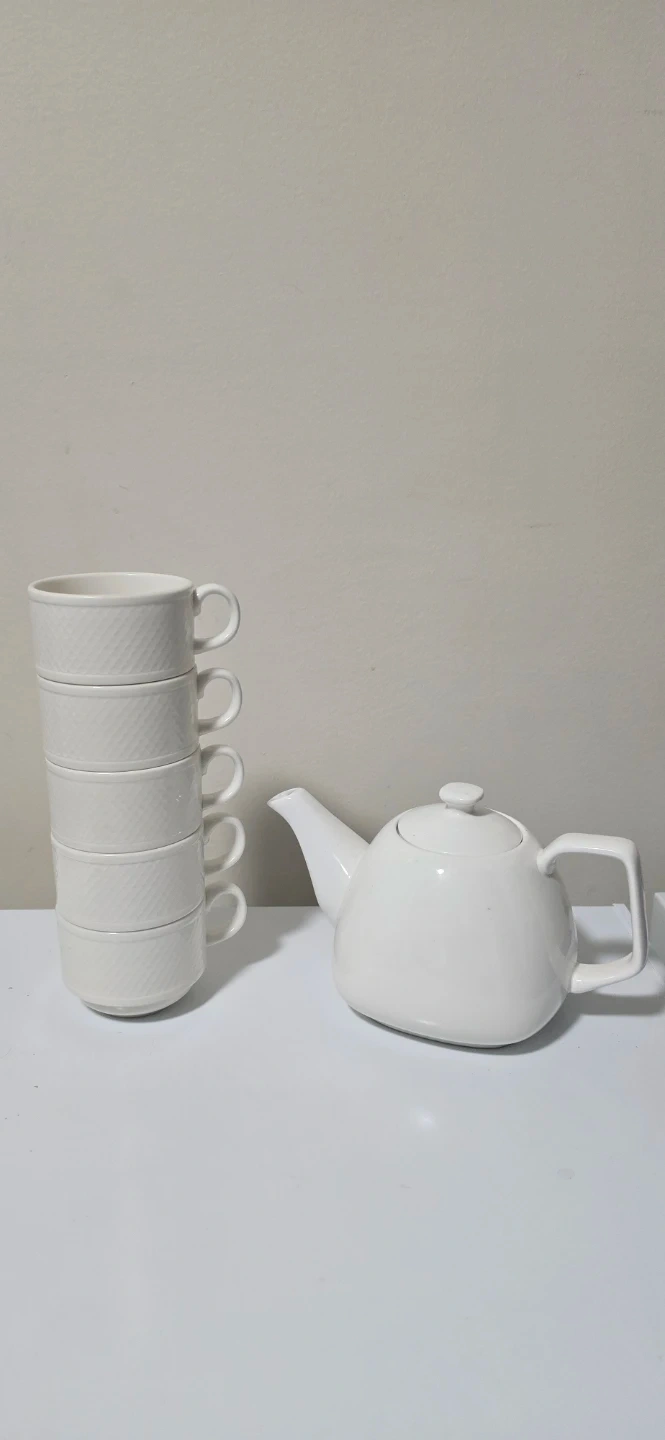 A white ceramic teapot with five matching stackable mugs. This set is perfect for serving tea or coffee. The mugs stack neatly for convenient storage.
