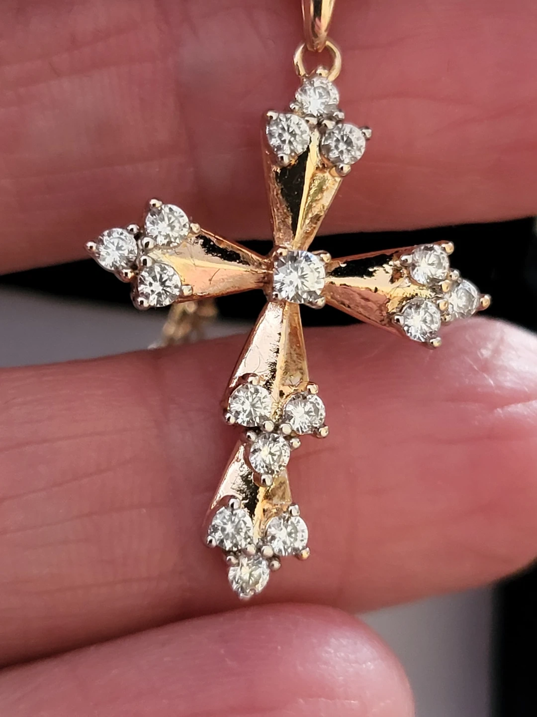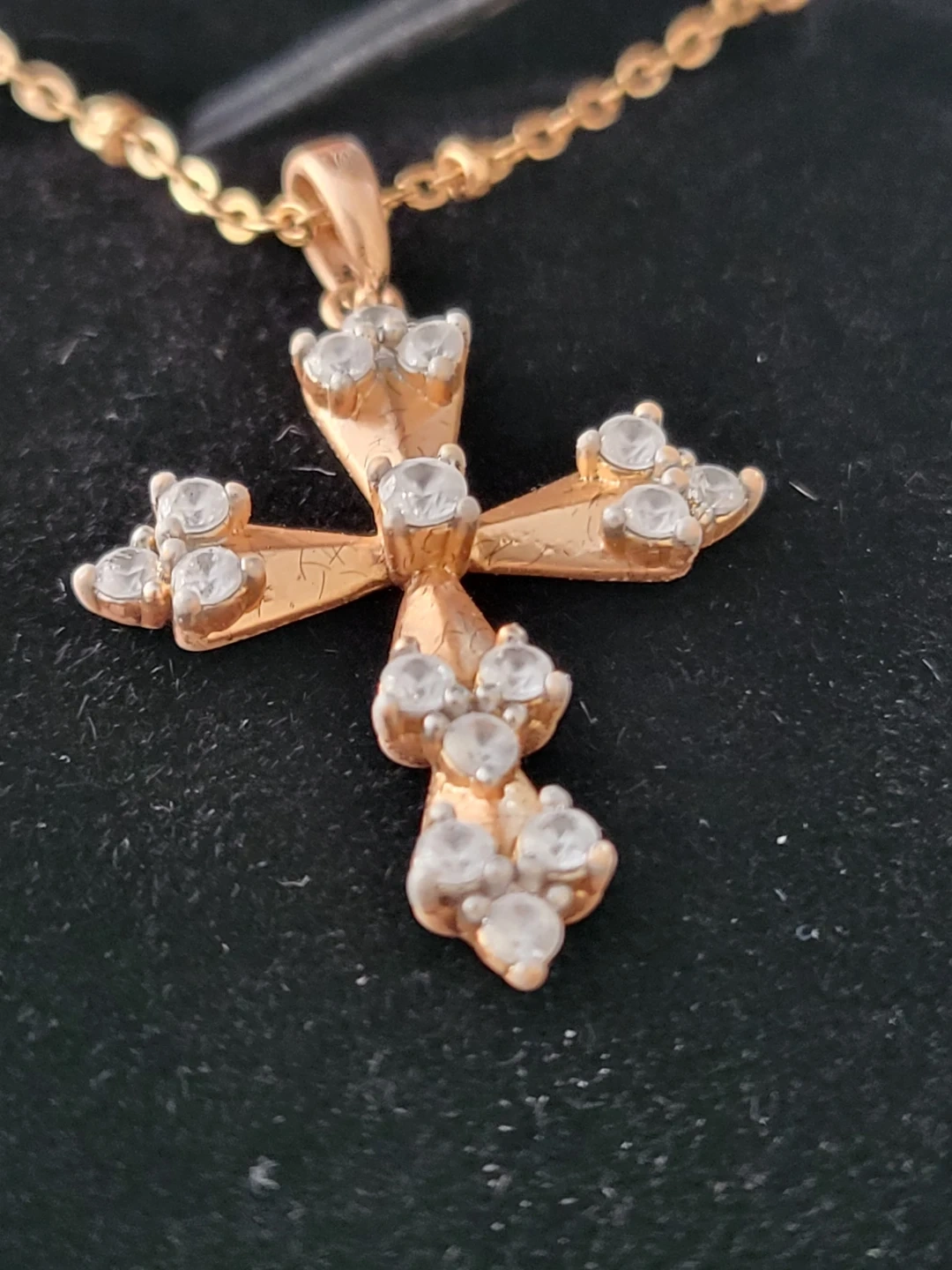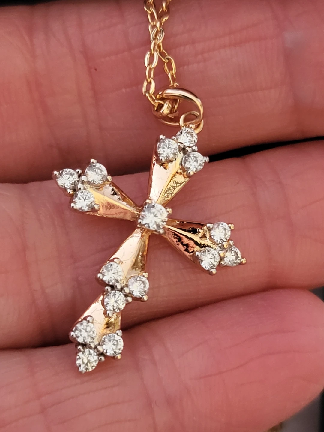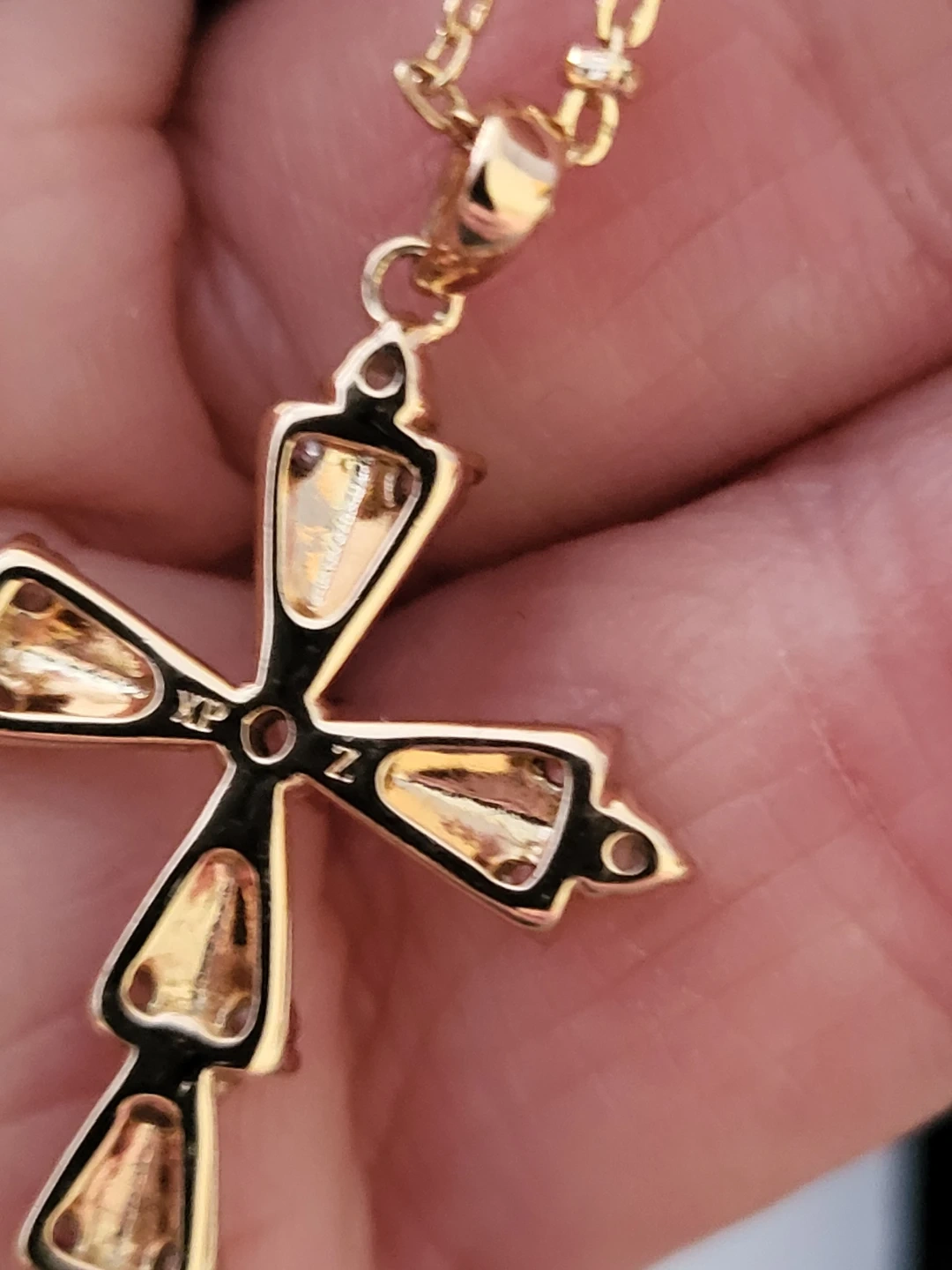 18K Gold Plated 32mm cross pendant necklace with Cubic Zirconia stones. It's 17 inches long. A lovely piece for everyday wear or special occasions!