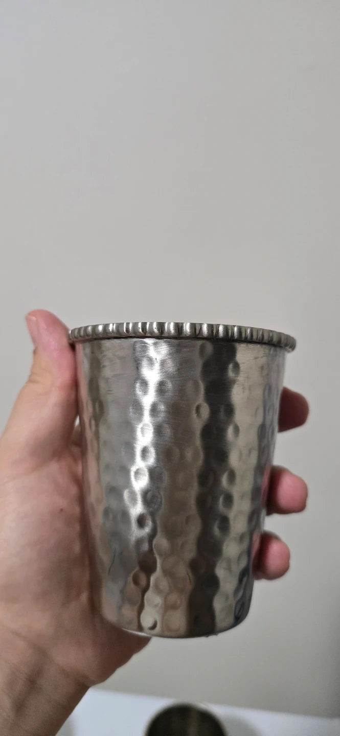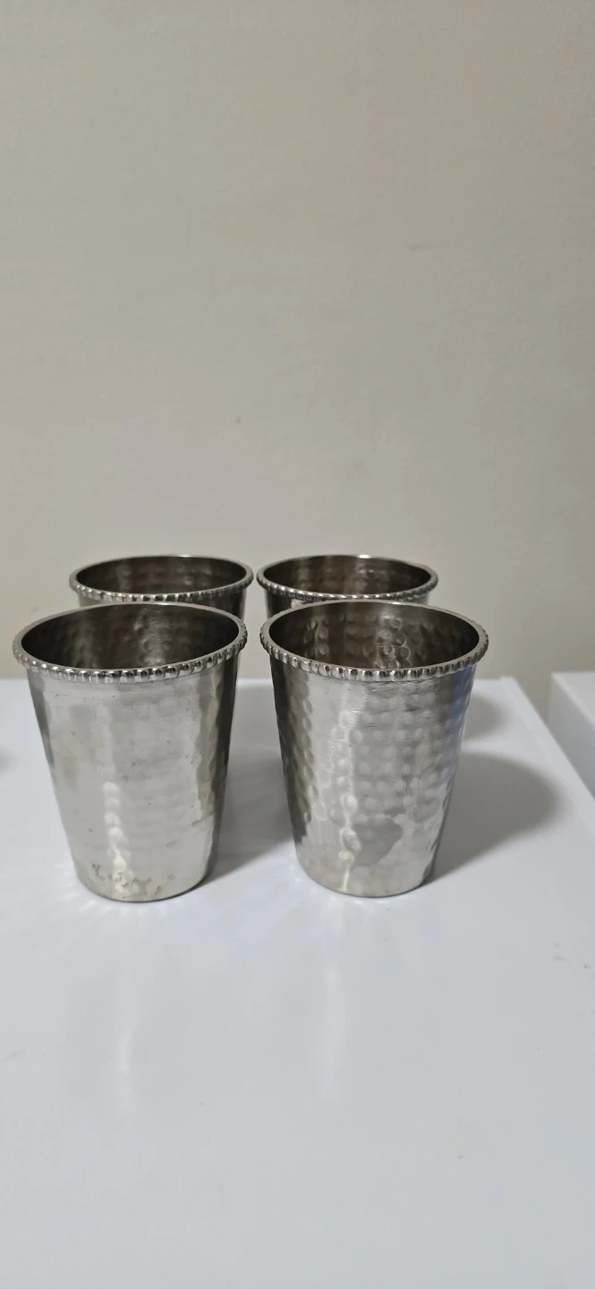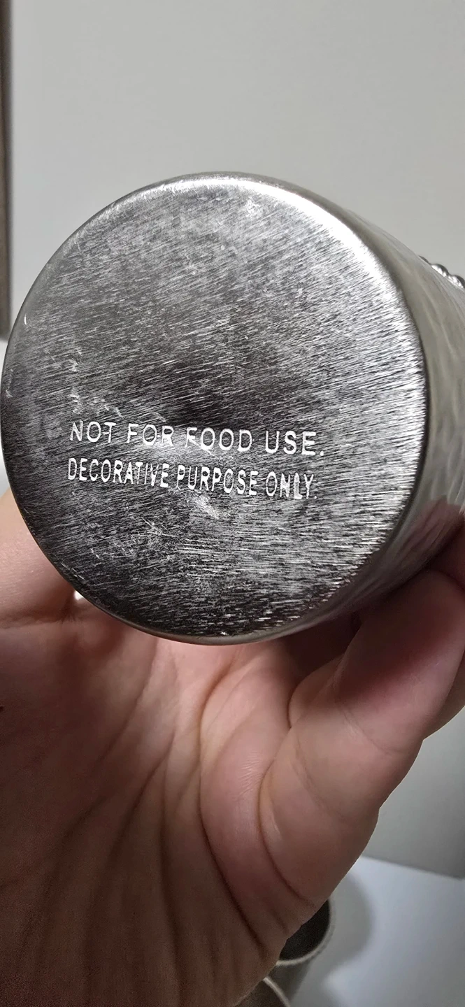 This set includes four hammered metal cups. They're clearly marked 'NOT FOR FOOD USE' and are intended for decorative purposes only. These cups have a textured exterior and a beaded rim.