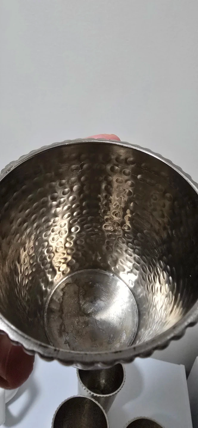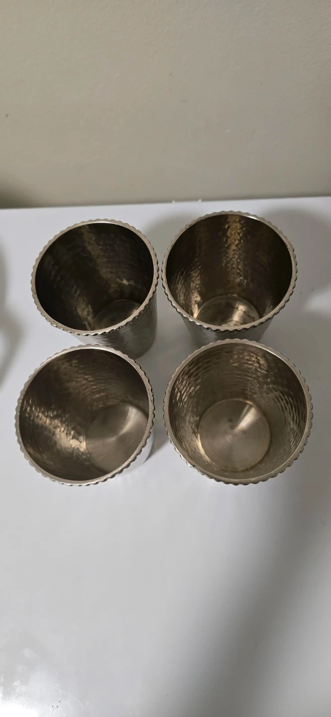 This set includes four hammered metal cups. They're clearly marked 'NOT FOR FOOD USE' and are intended for decorative purposes only. These cups have a textured exterior and a beaded rim.
