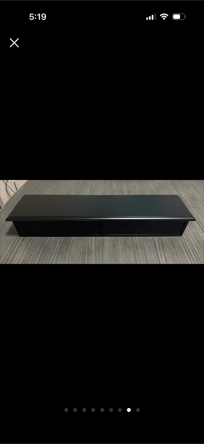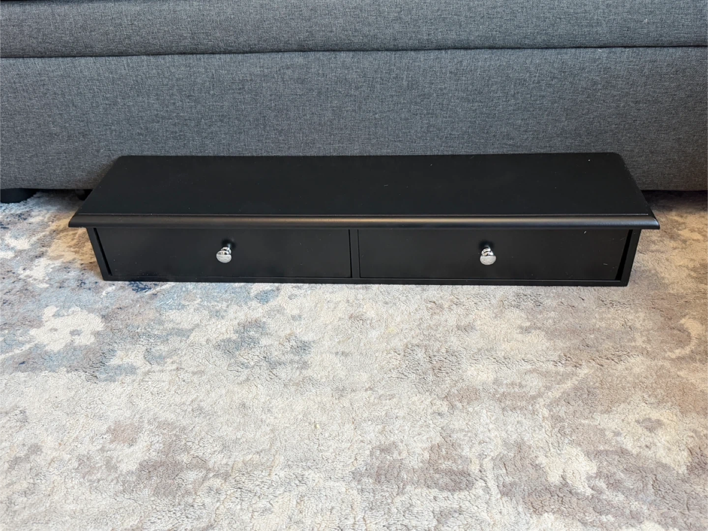 A sleek black floating shelf with two drawers. It's perfect for adding storage and style to any room.
