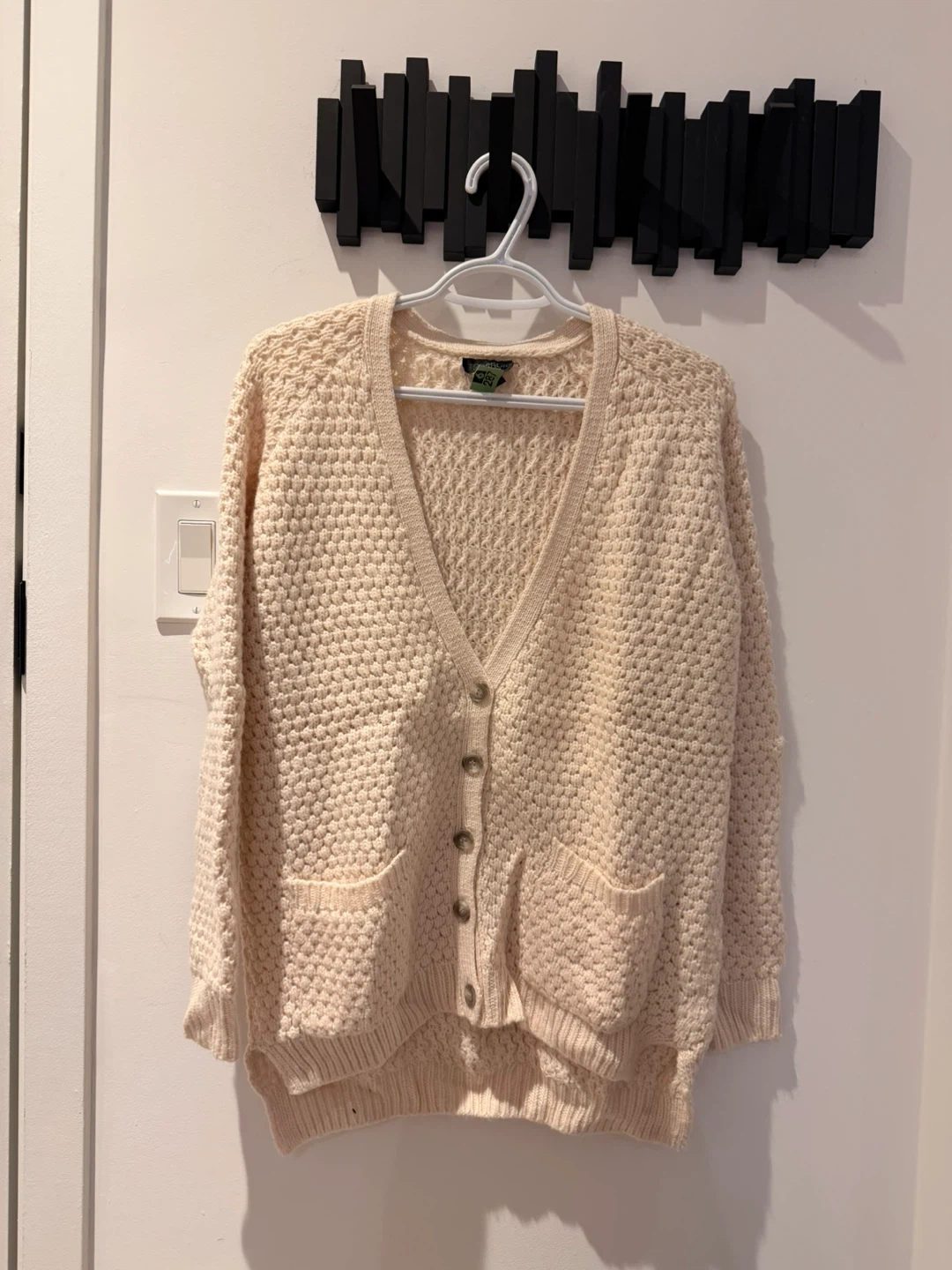Cream knit cardigan sweater from TOPSHOP. It has a V-neckline with button closures and two front pockets. Made from a soft knit material.