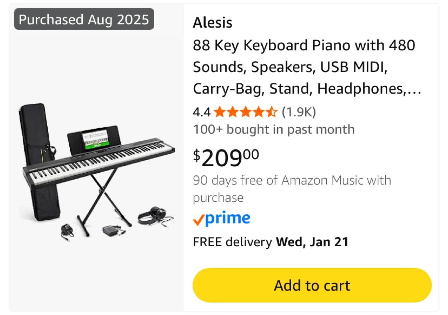 This is an Alesis 88-key digital piano with 480 sounds and built-in speakers. It includes a carry bag, sheet music stand, sustain pedal, headphones, power adapter, and an adjustable keyboard stand.