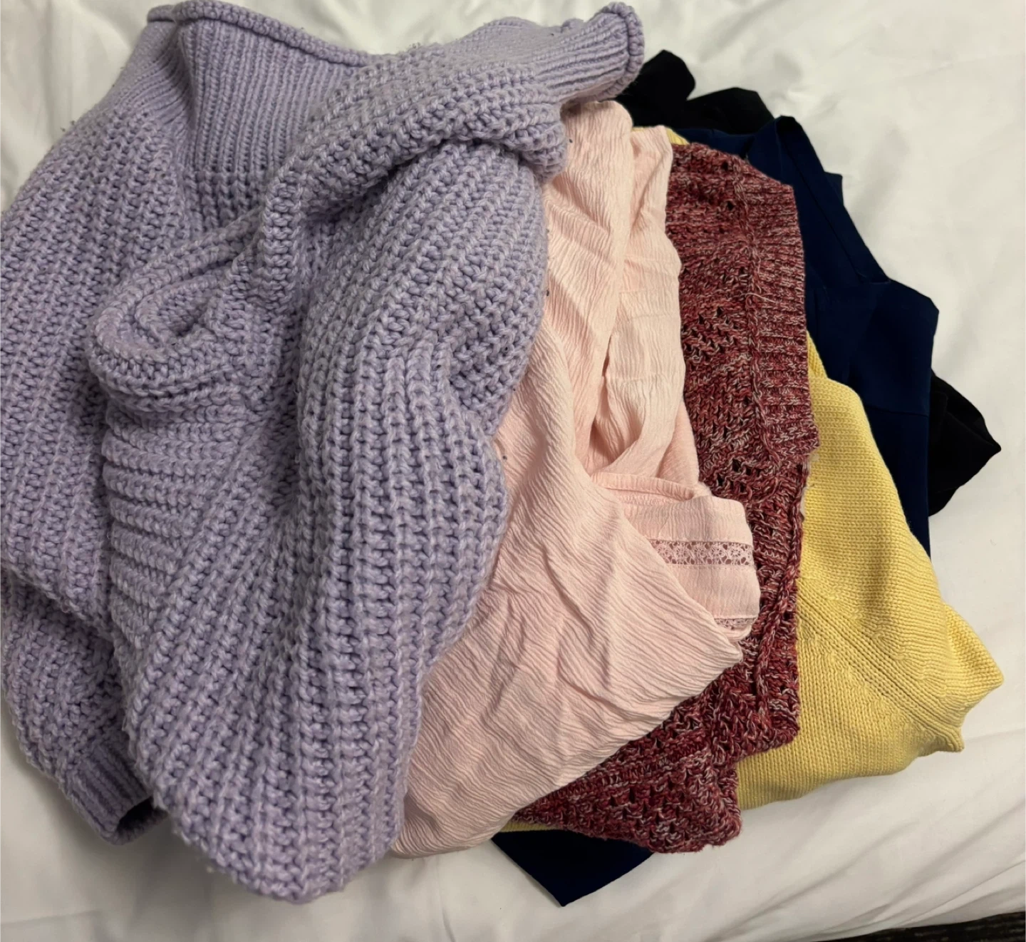 This bundle includes several women's tops in different colours and styles. You'll find a lavender knit sweater, a light pink crinkled top, a marled red sweater, a navy sleeveless top, a black top, and a yellow sweater. Great for layering or standalone outfits!