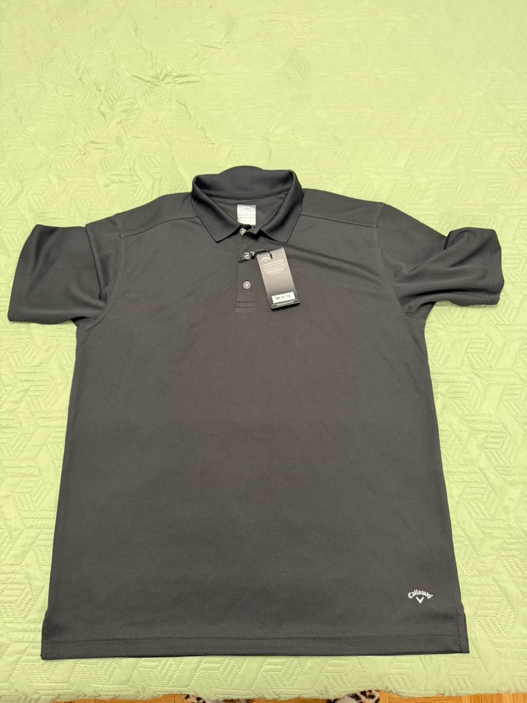 This is a Callaway Opti-Dri golf polo shirt in black. It's a size L. The fabric is designed for performance.
