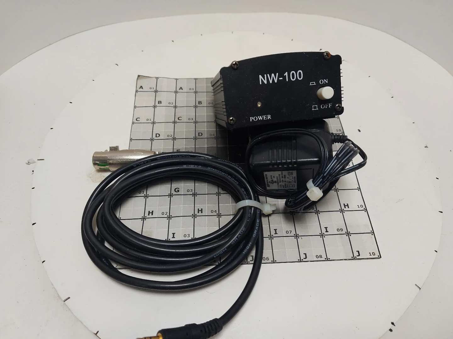 Used phantom power supply for condenser mics. Includes power adapter and cables. Clean XLR connections, works perfectly. Essential if your audio interface doesn't provide phantom power.
