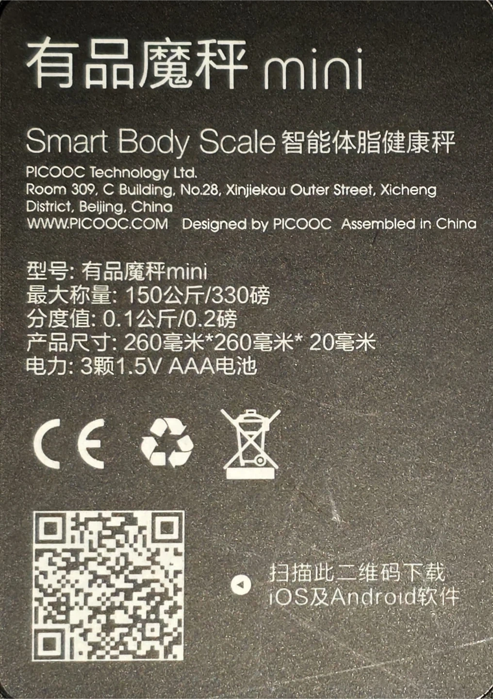 PICOOC Mini smart body scale. Measures weight up to 150kg/330lbs with a 0.1kg/0.2lbs division. Powered by 3 x 1.5V AAA batteries.