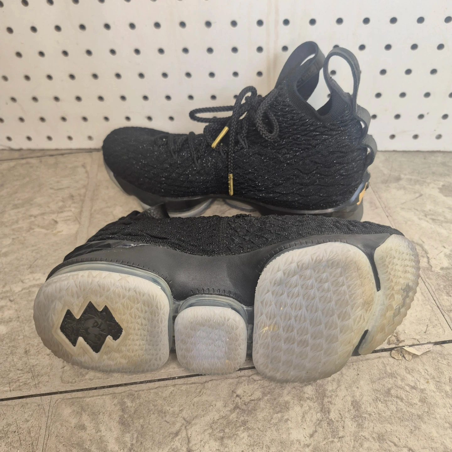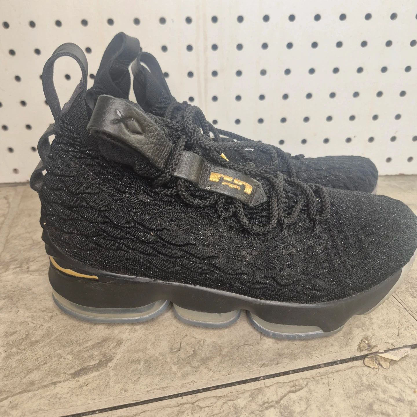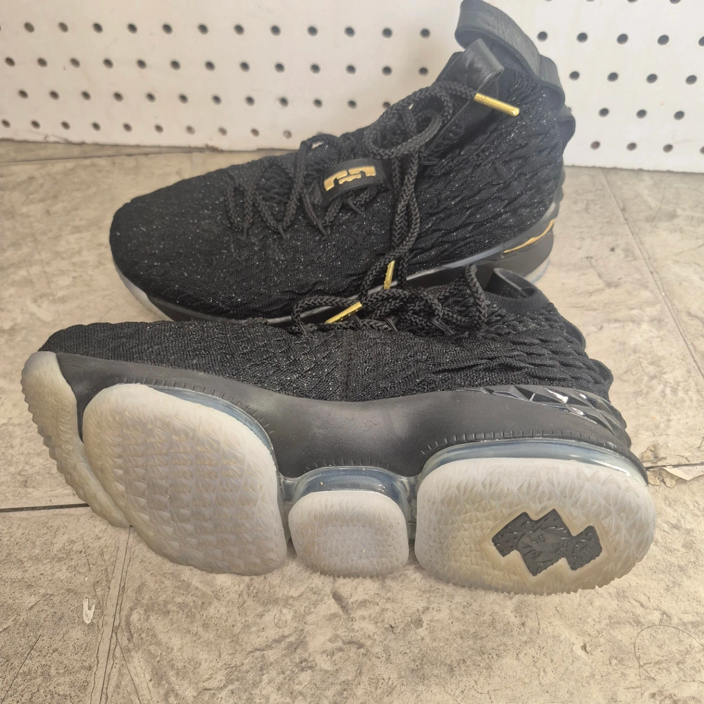 Nike LeBron 15 basketball shoes in black and gold. Knit upper with lace-up closure. Features a visible Air Max unit in the sole for cushioning. Great for the court!