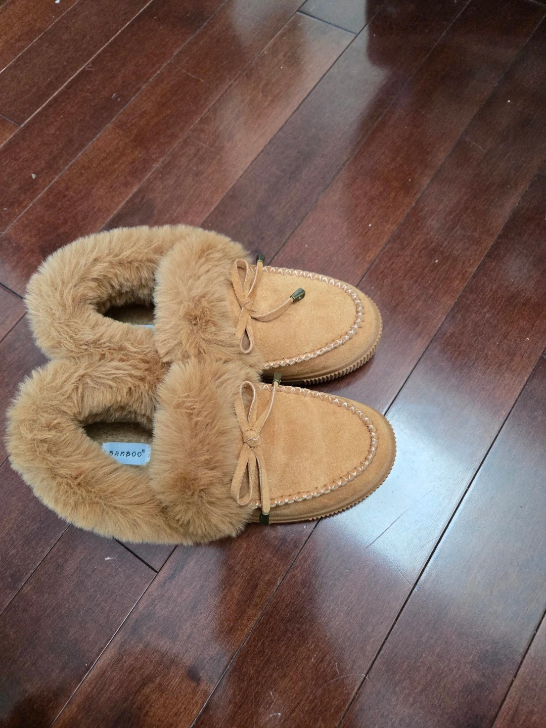 These cozy bamboo moccasin slippers are lined with super-soft faux fur. They feature a classic moccasin design with a decorative bow. Perfect for keeping your feet warm and comfy around the house!