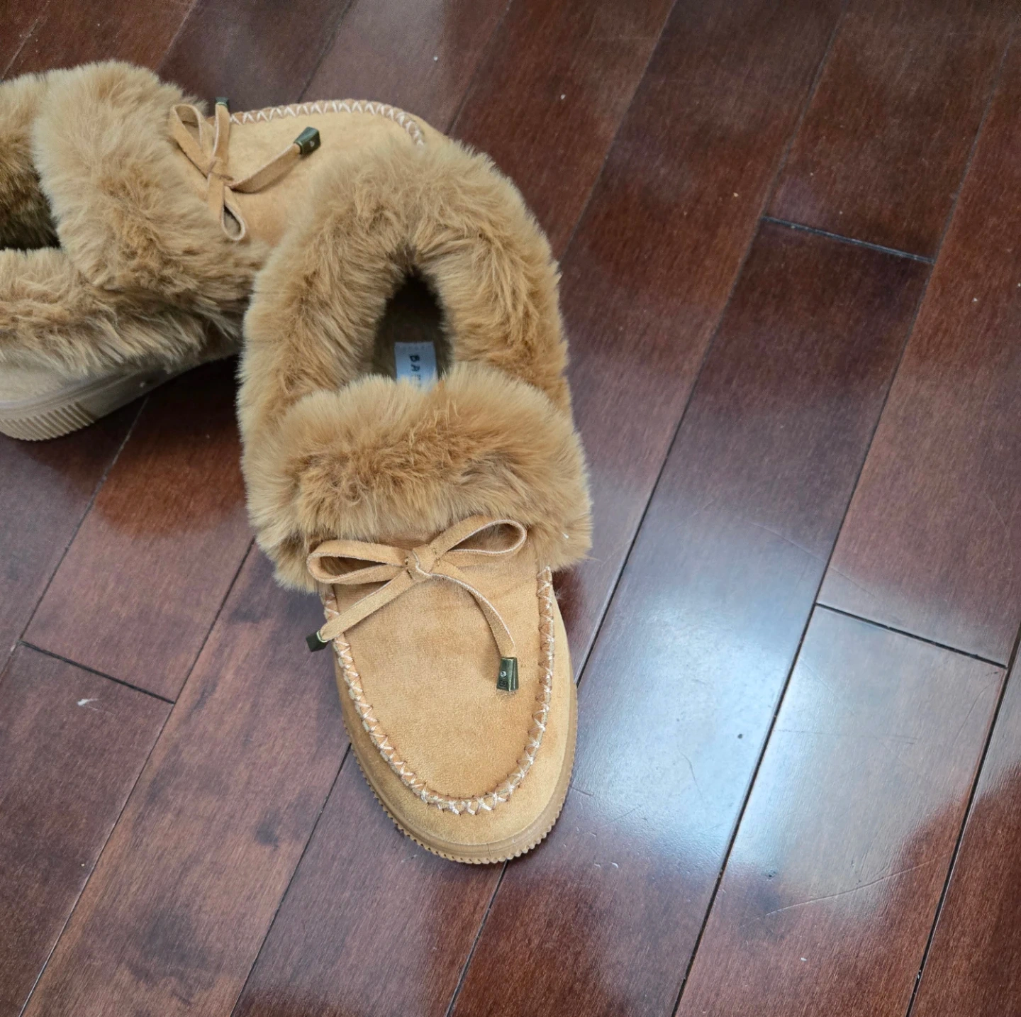 These cozy bamboo moccasin slippers are lined with super-soft faux fur. They feature a classic moccasin design with a decorative bow. Perfect for keeping your feet warm and comfy around the house!