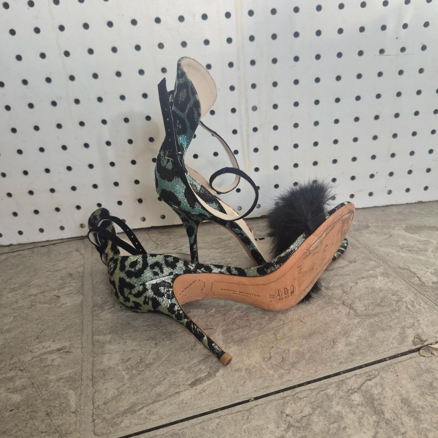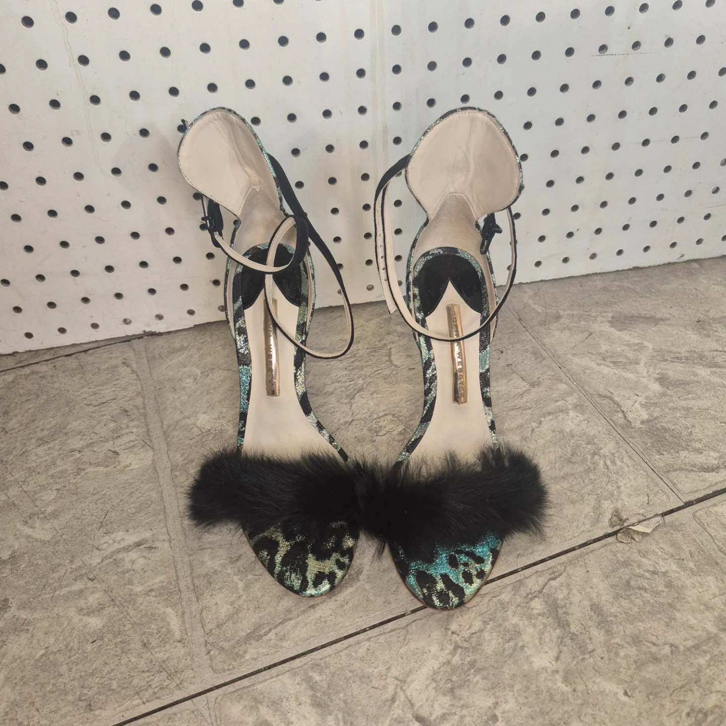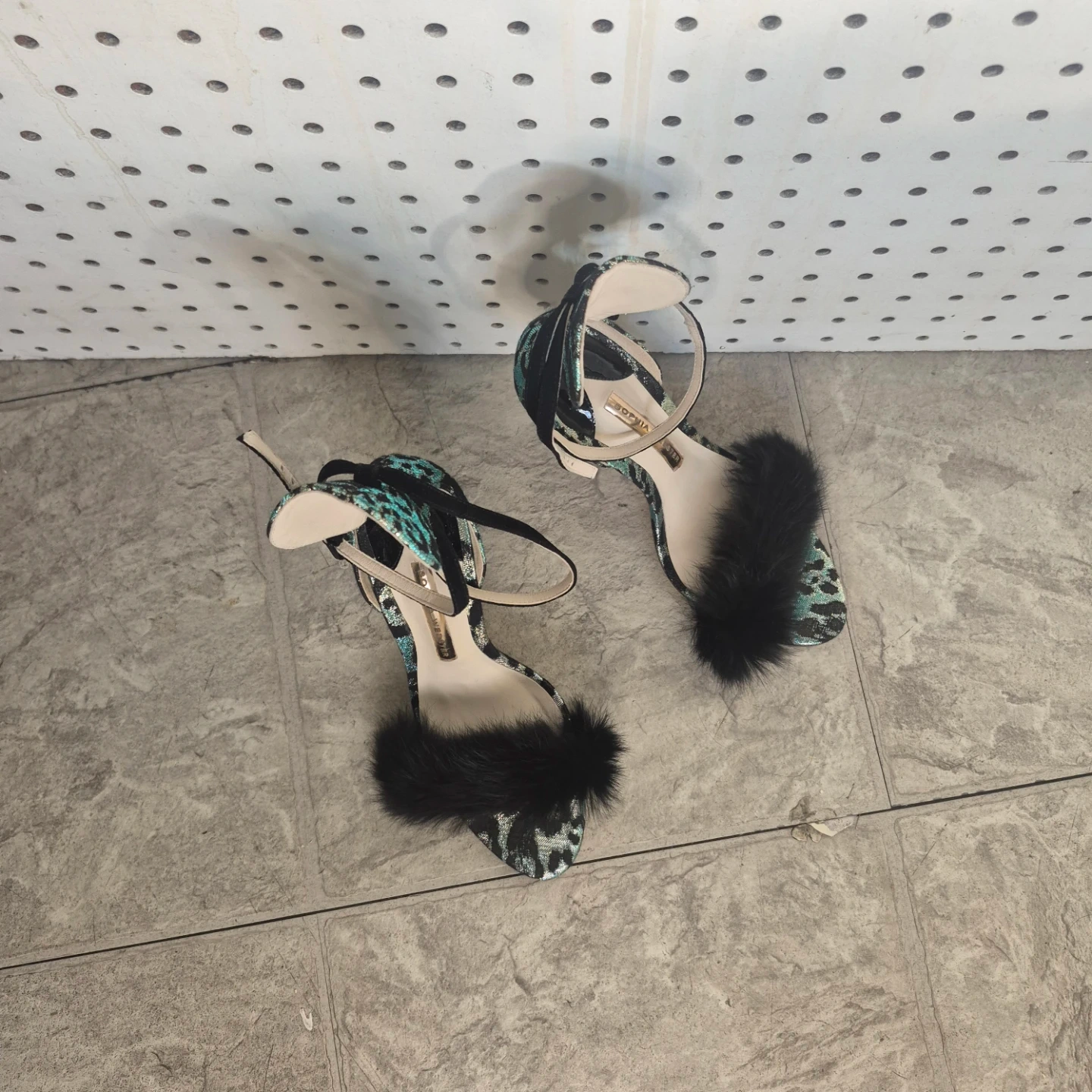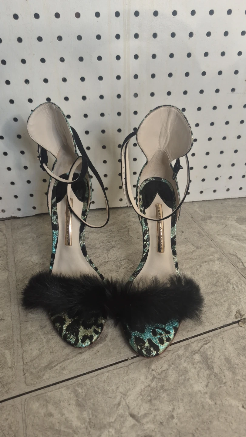 Sophia Webster women's heels with a black fur trim and a patterned sequin exterior. These statement heels feature ankle straps and a stiletto heel. They're sure to turn heads!