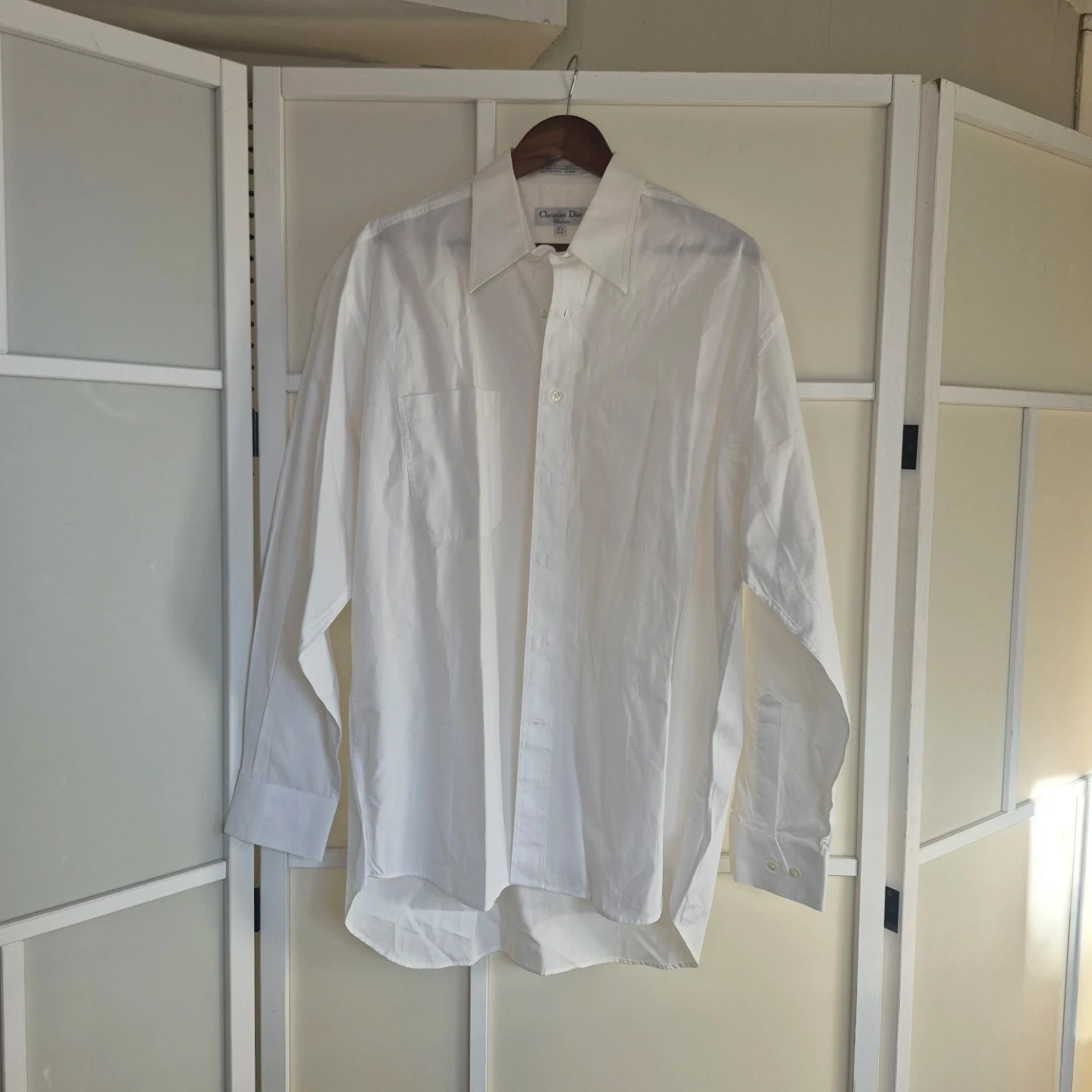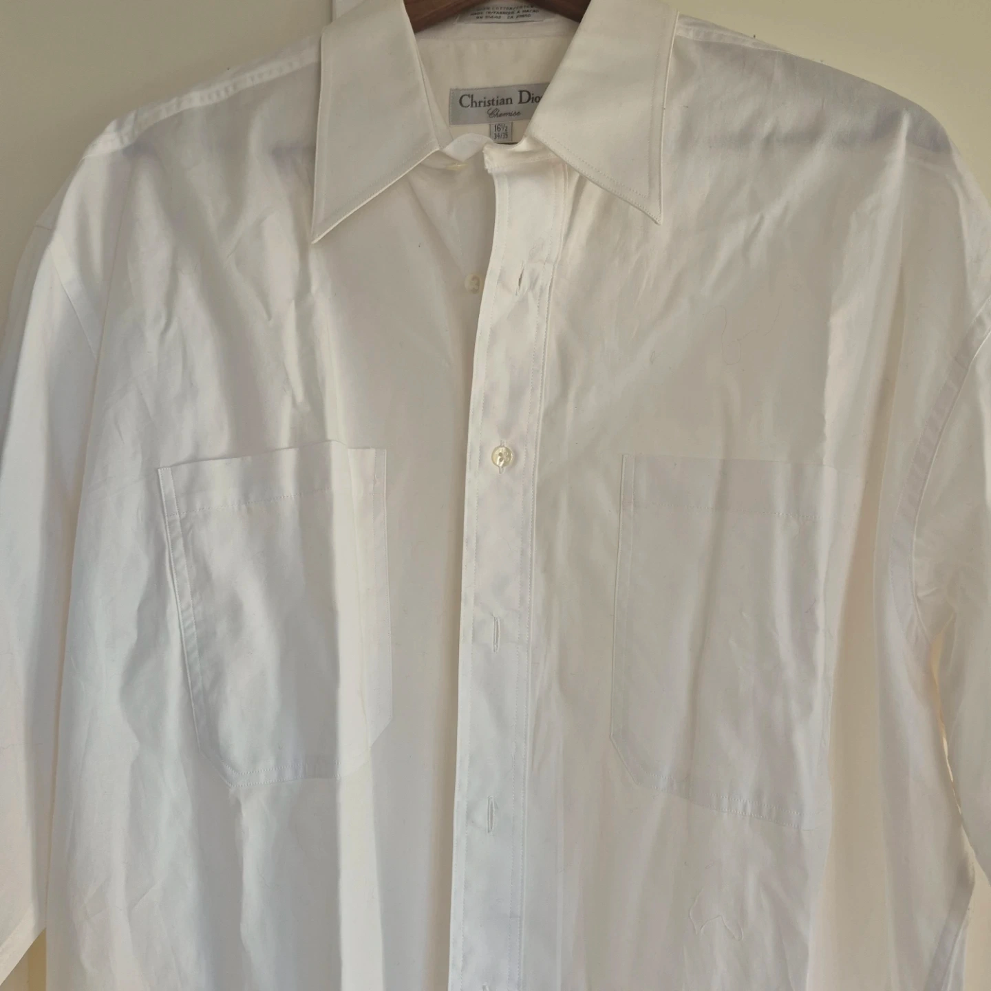 Classic white dress shirt from Christian Dior. Made of 100% cotton. Features two chest pockets and button-up closure. Size 16 1/2 (34/35).