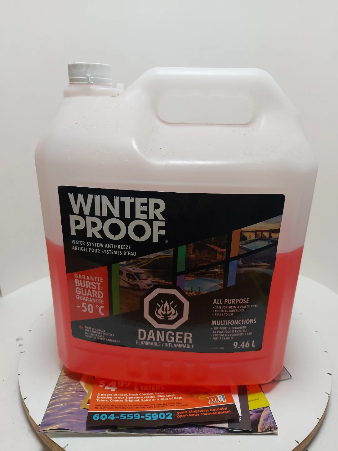 Approximately half a 9.46L jug of Winter Proof RV antifreeze (-50°C rated). Pink, suitable for water systems. Still good, just don't need it anymore.