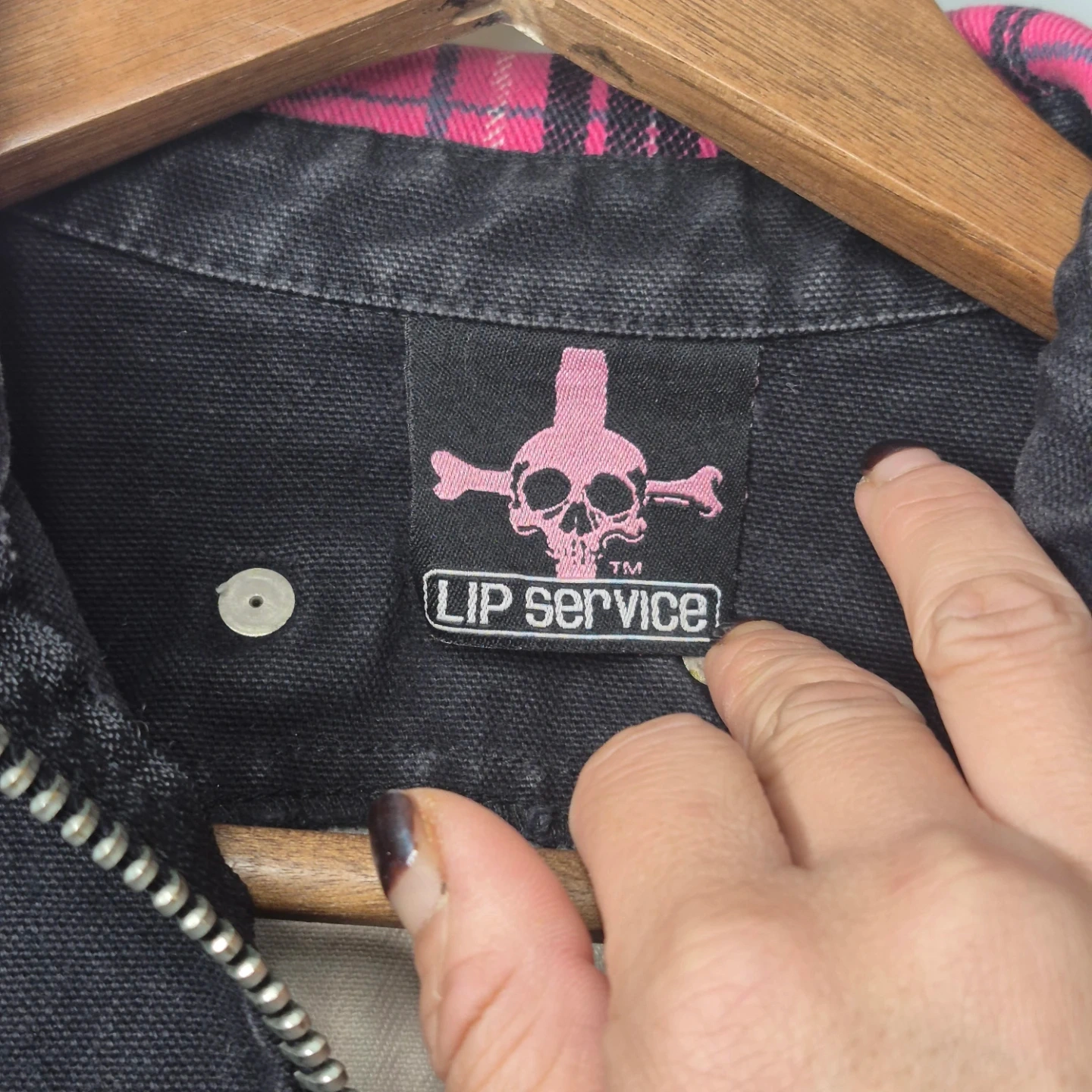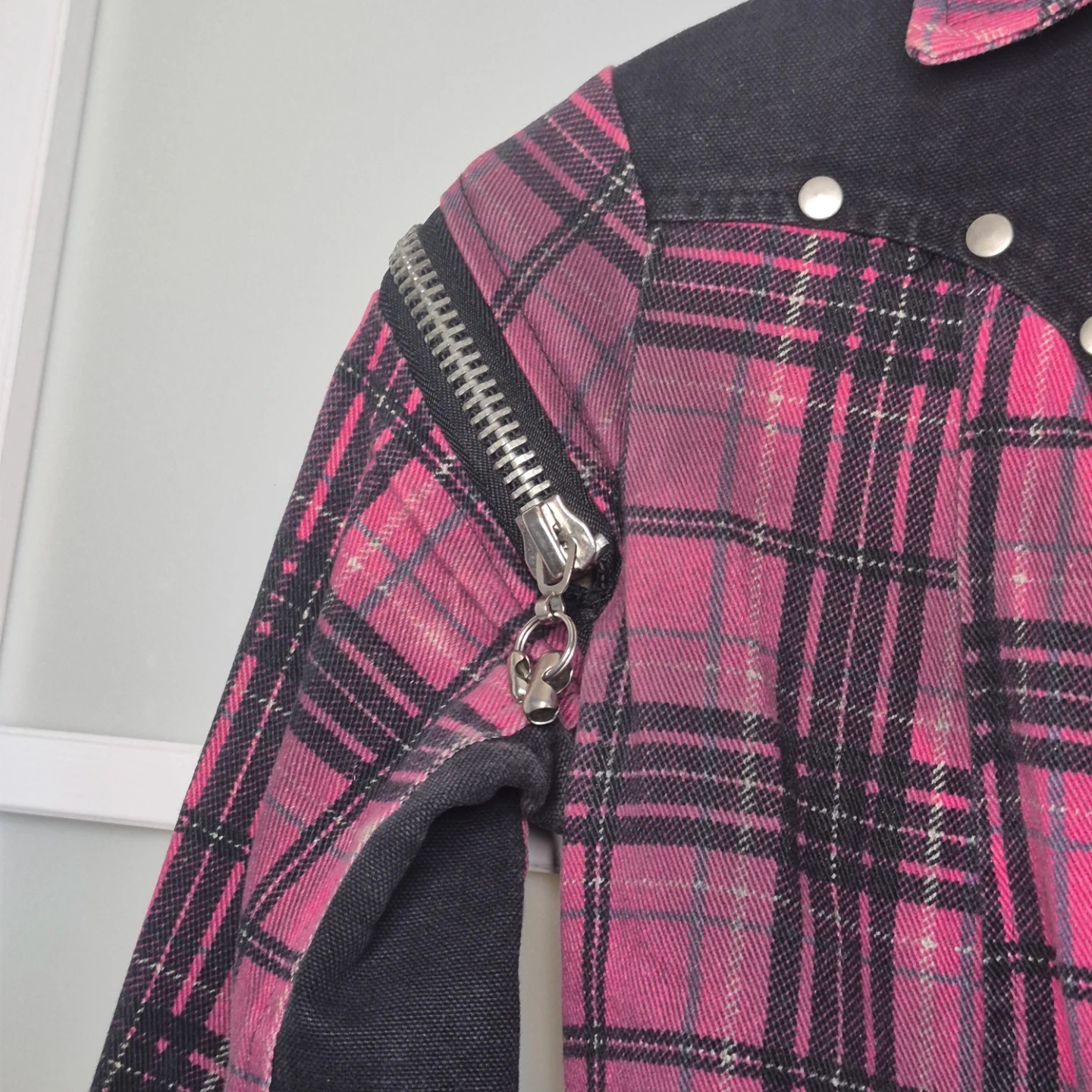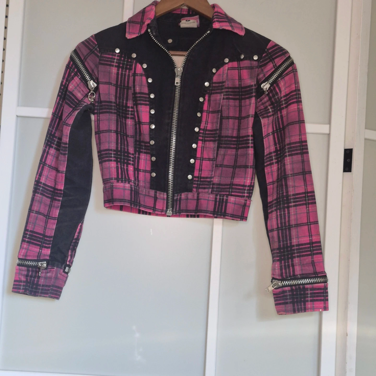 This pink plaid jacket features black denim accents and multiple zipper details on the front and sleeves. It's a cropped style with silver stud detailing along the front placket. Great statement piece!