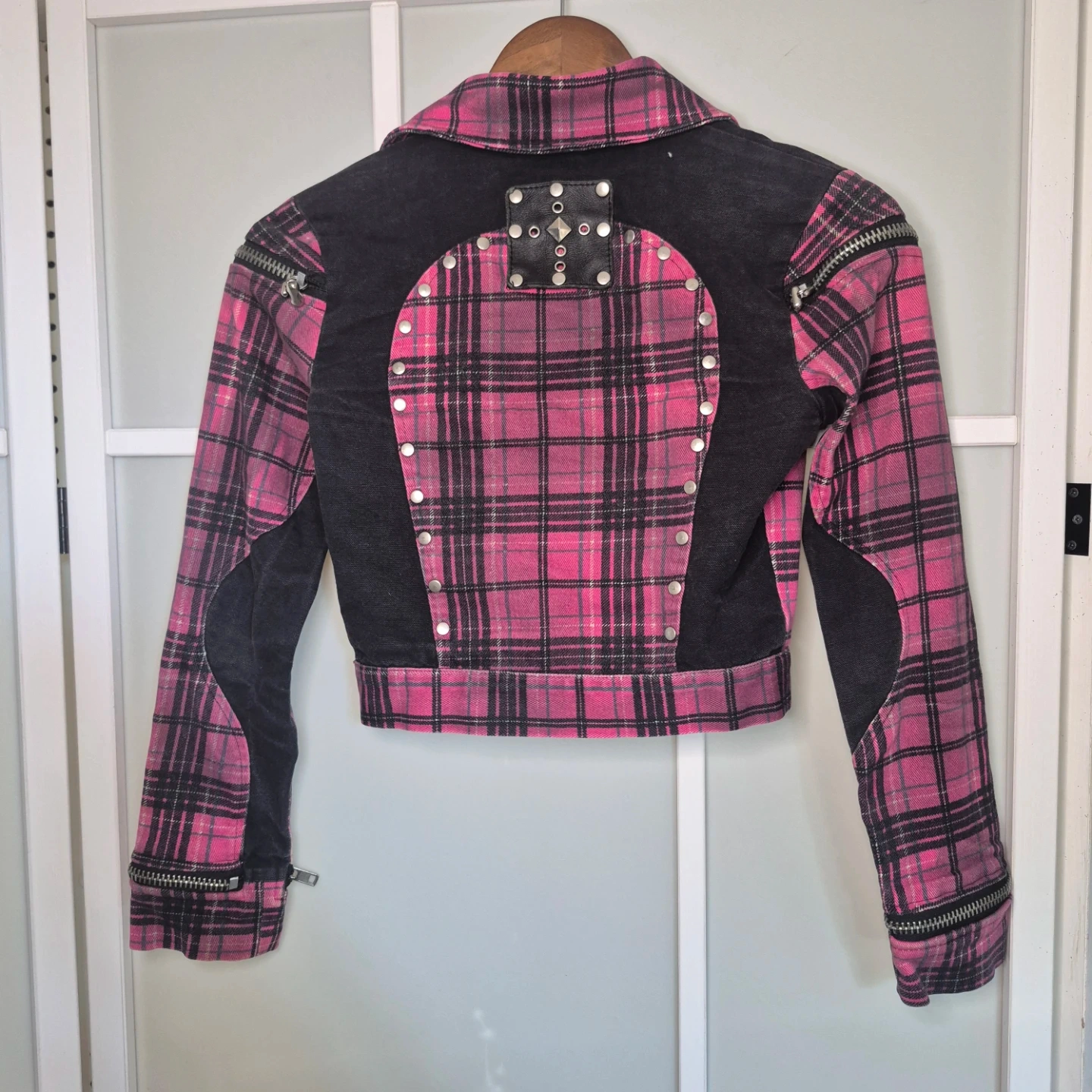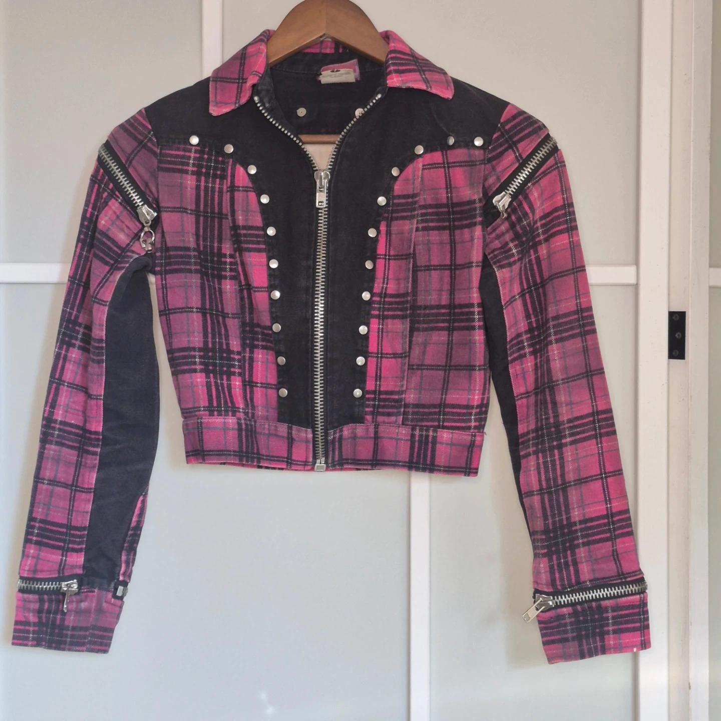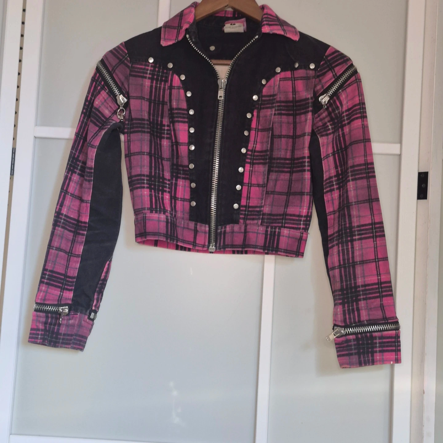 This pink plaid jacket features black denim accents and multiple zipper details on the front and sleeves. It's a cropped style with silver stud detailing along the front placket. Great statement piece!