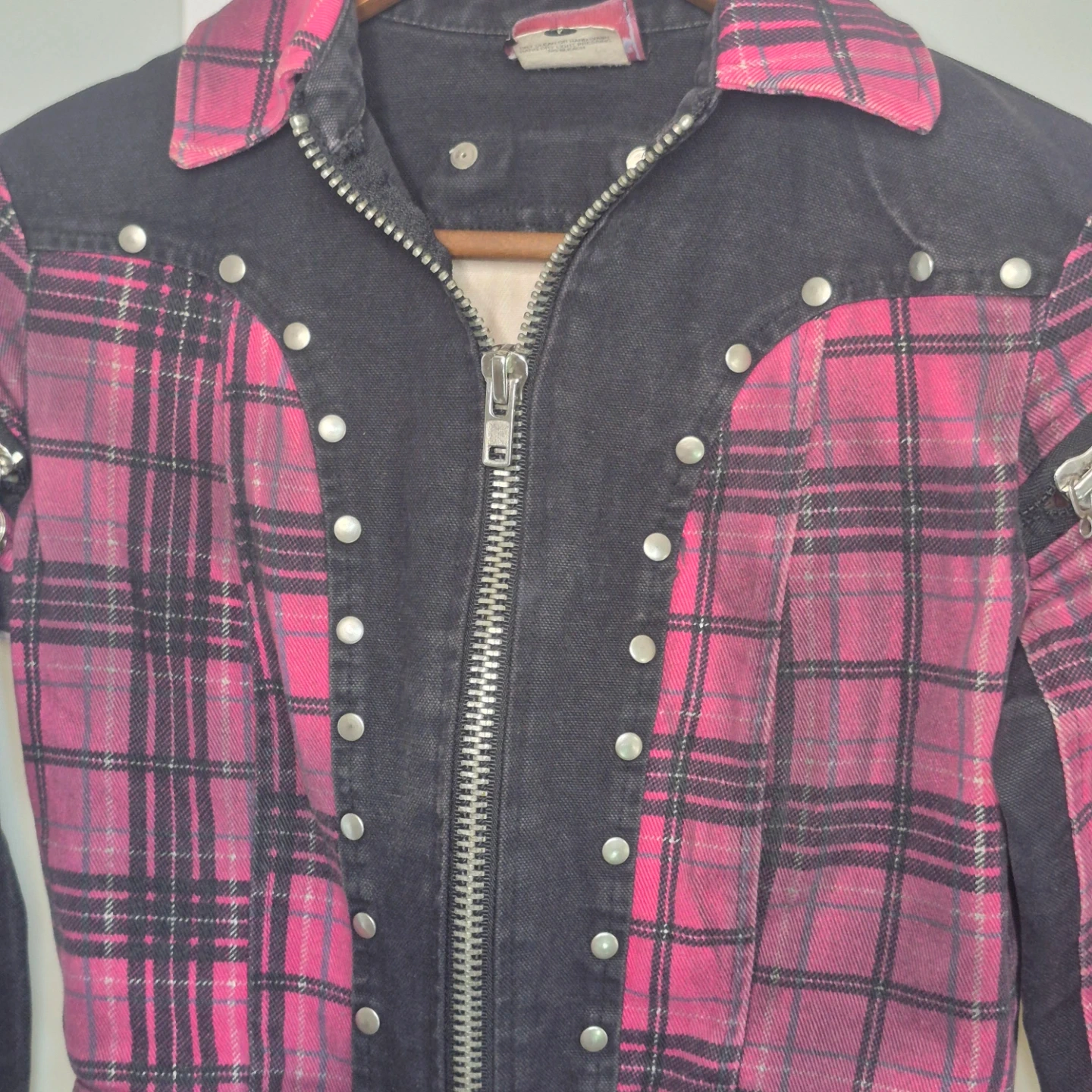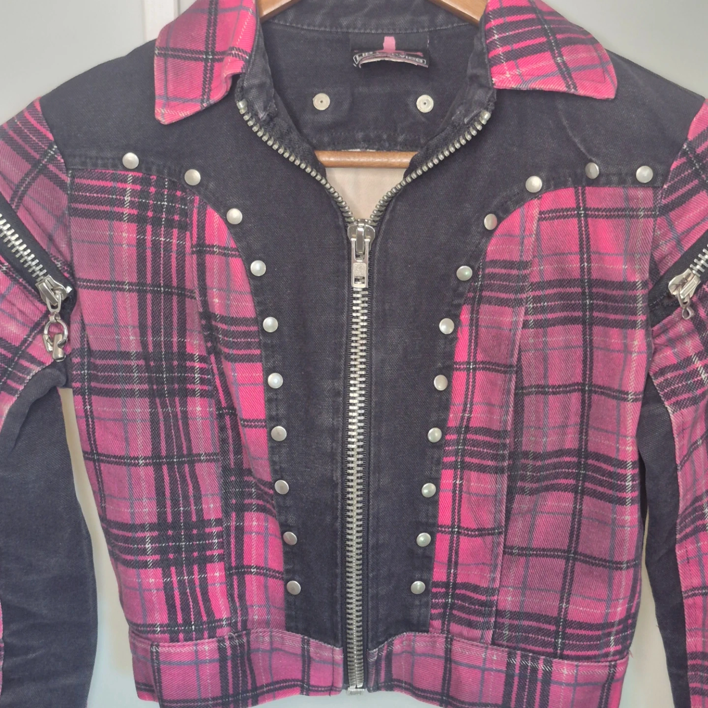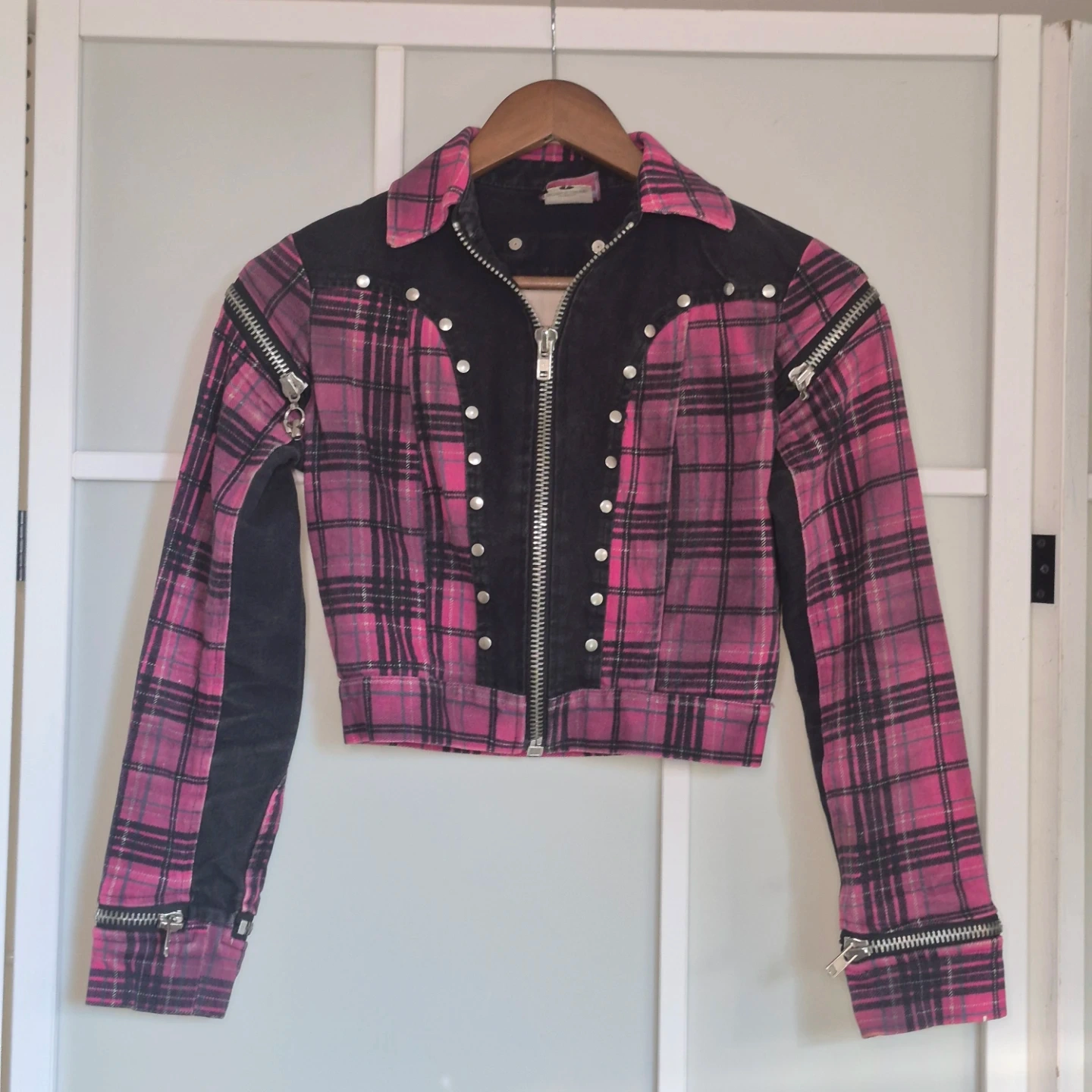 This pink plaid jacket features black denim accents and multiple zipper details on the front and sleeves. It's a cropped style with silver stud detailing along the front placket. Great statement piece!