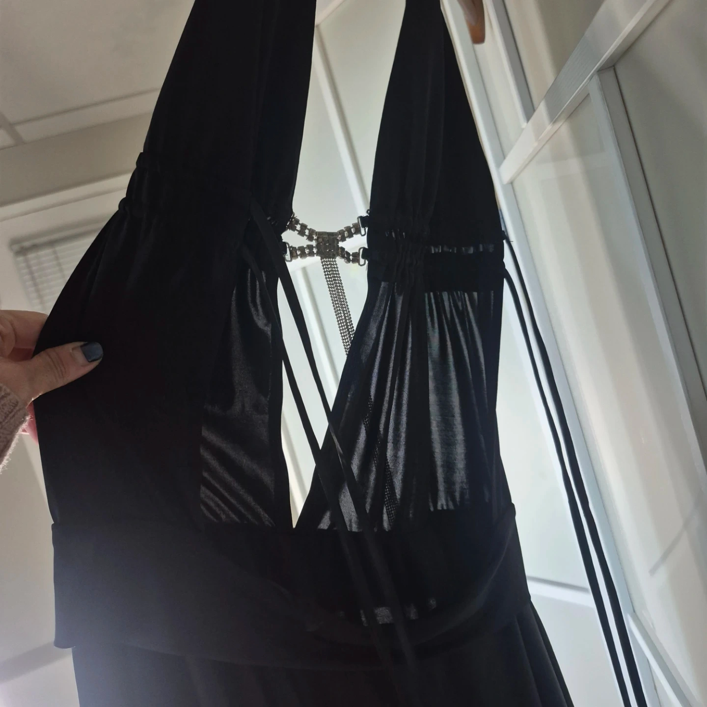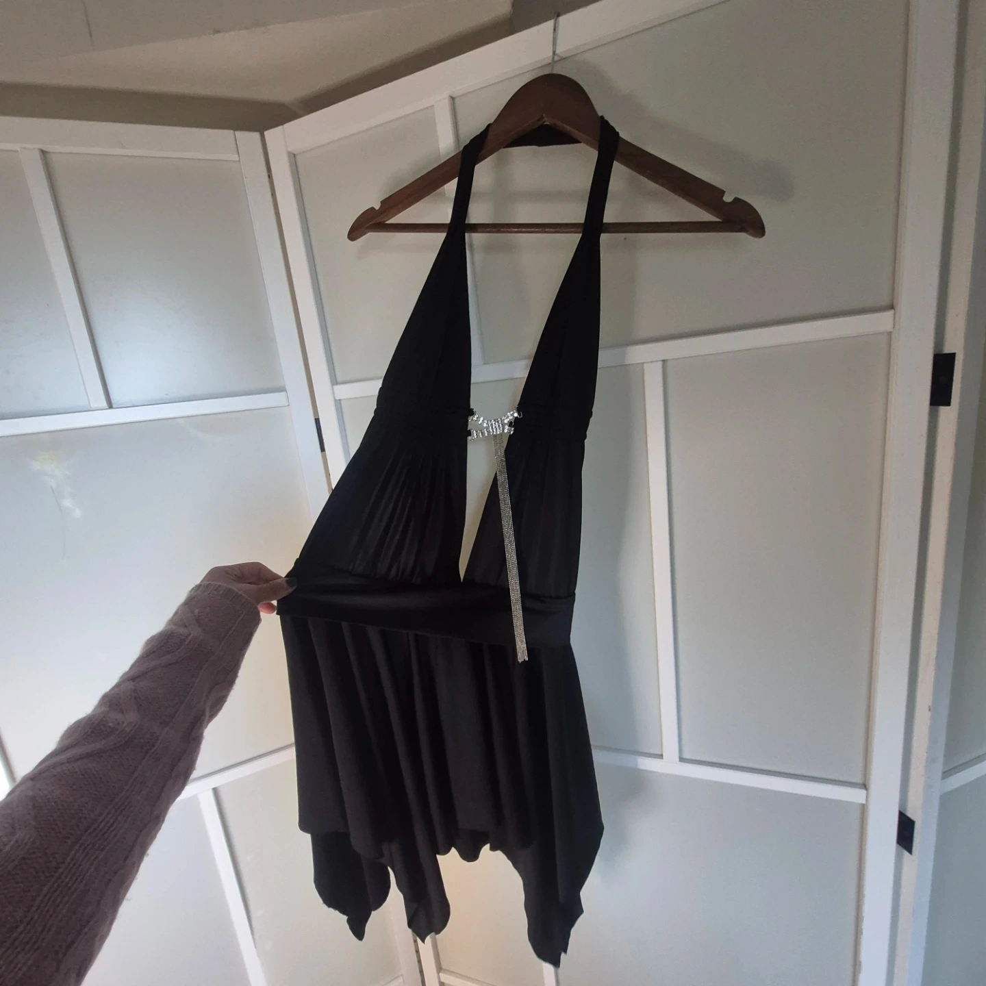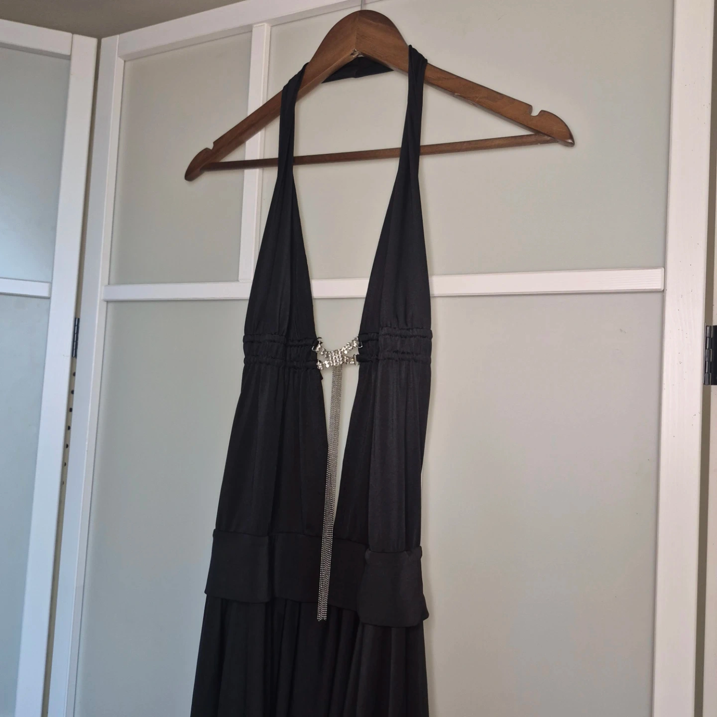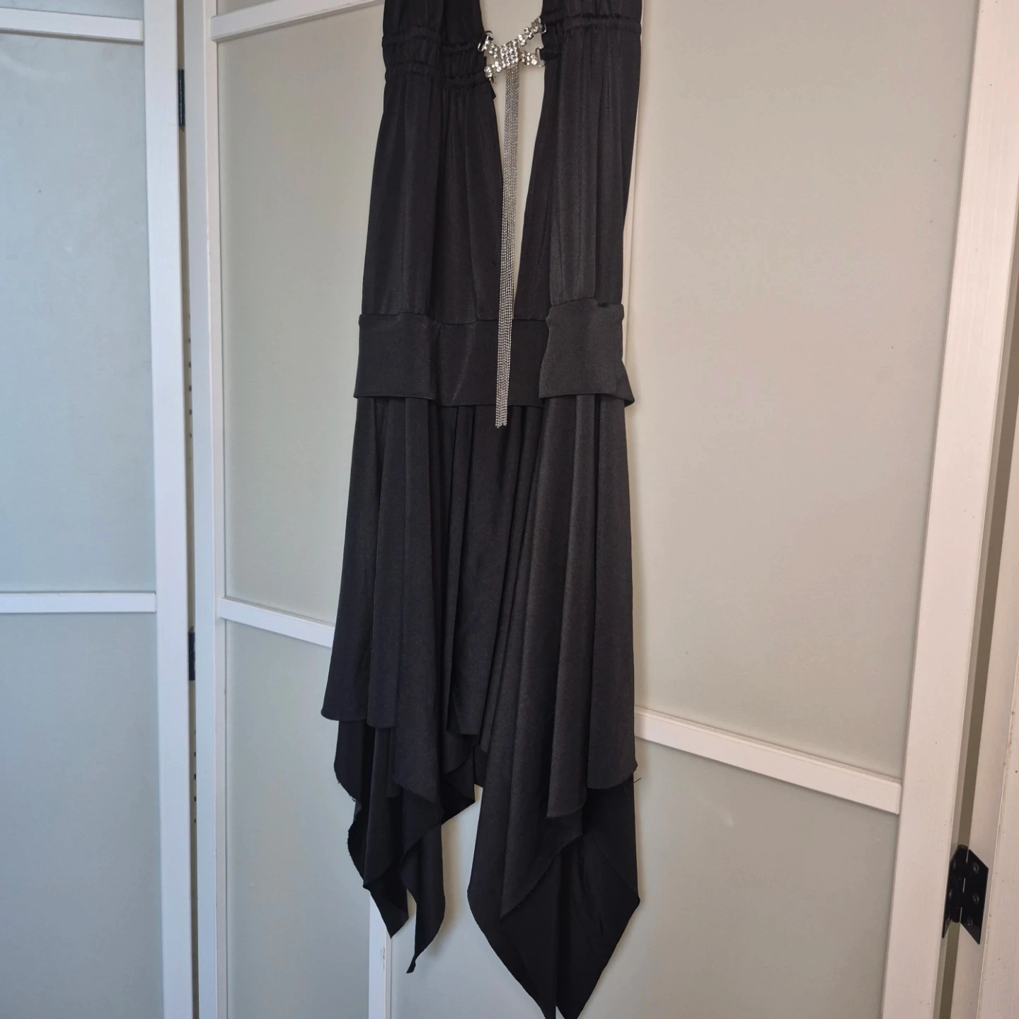 This black halter neck dress features a plunging V-neckline accented with a sparkling rhinestone chain detail. It has a layered, asymmetrical hemline for a flowing silhouette. Made of a lightweight, drapey fabric.