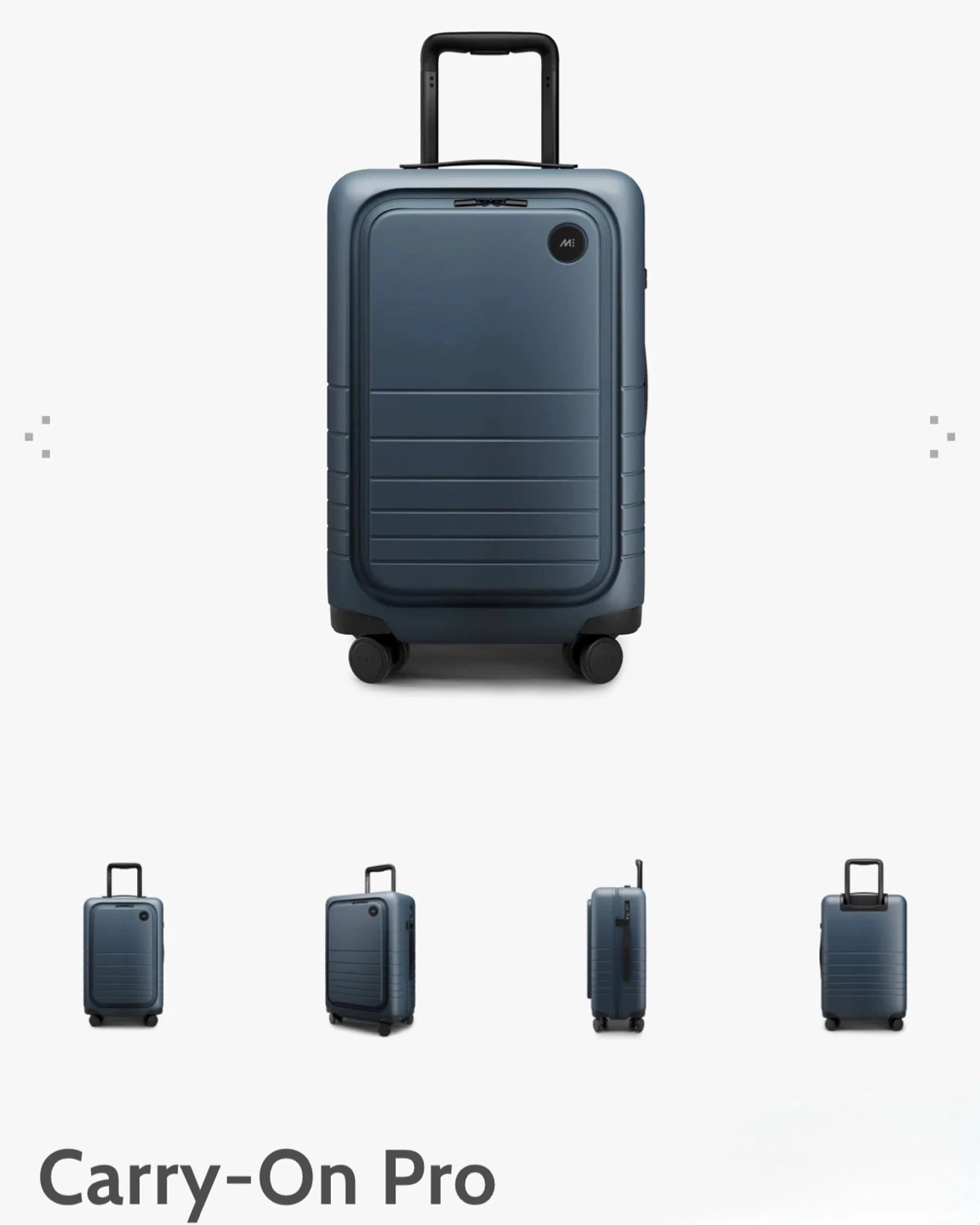 This is a Monos Carry-On Pro luggage. It's a hard-shell suitcase with a telescoping handle and spinner wheels. Made with durable polycarbonate.