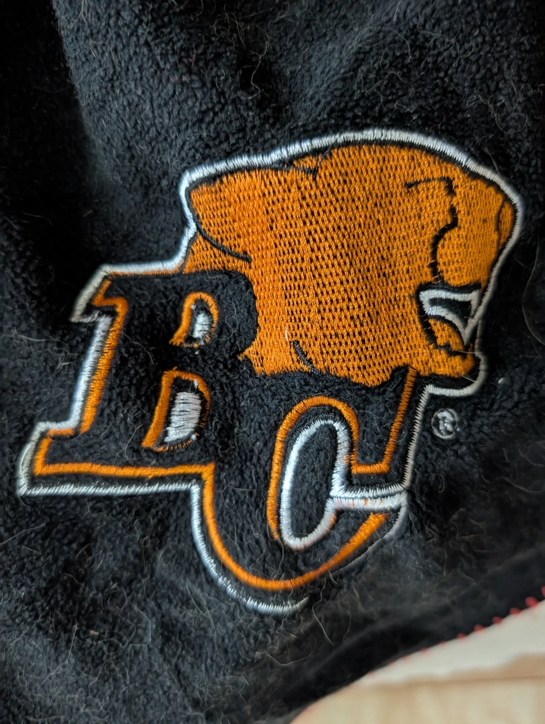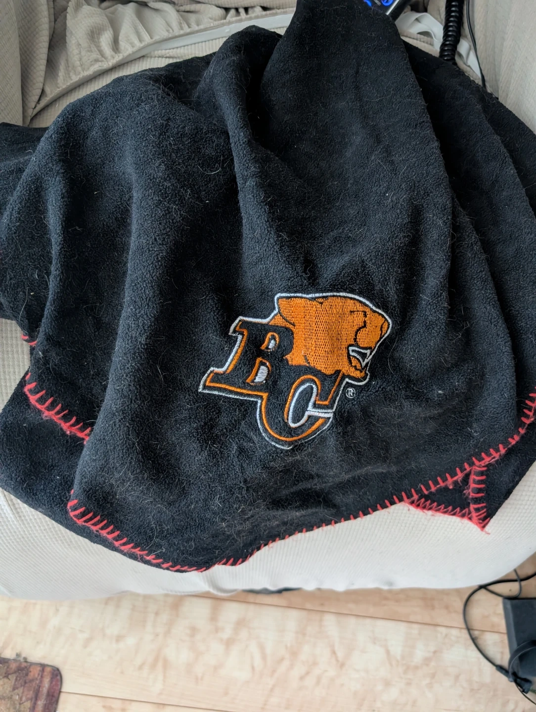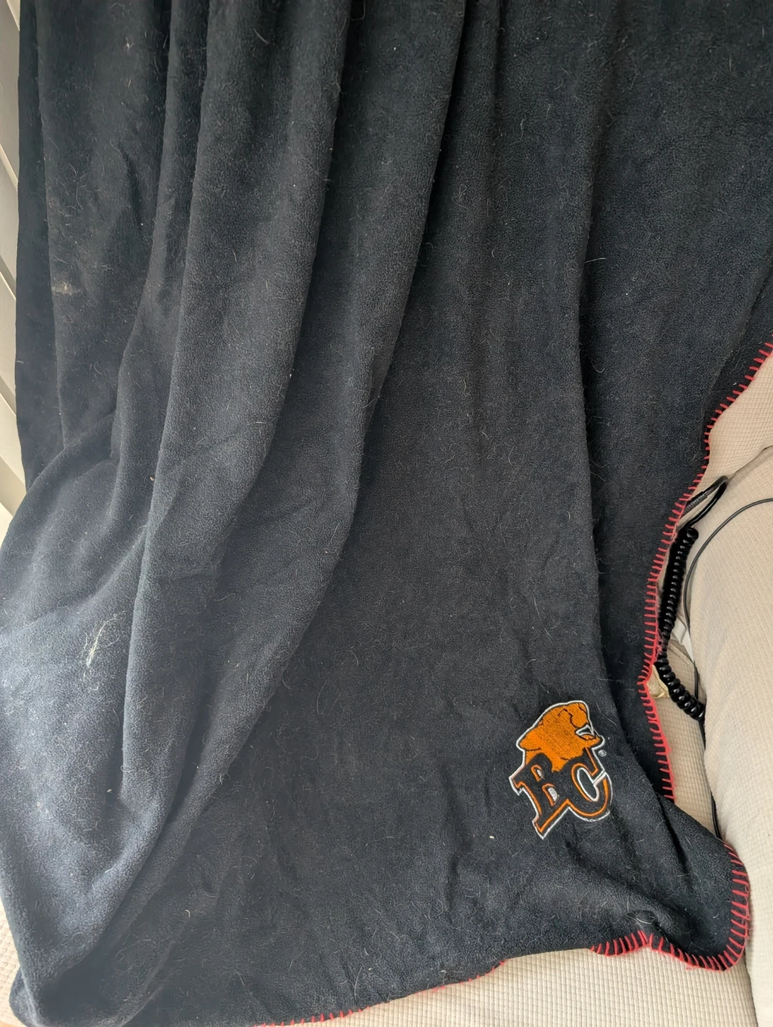 Black fleece throw blanket featuring the BC Lions logo. It's edged with red stitching. Measures approx. 45" x 60". It is unused and has been in storage. It is from about the year 2000. $20