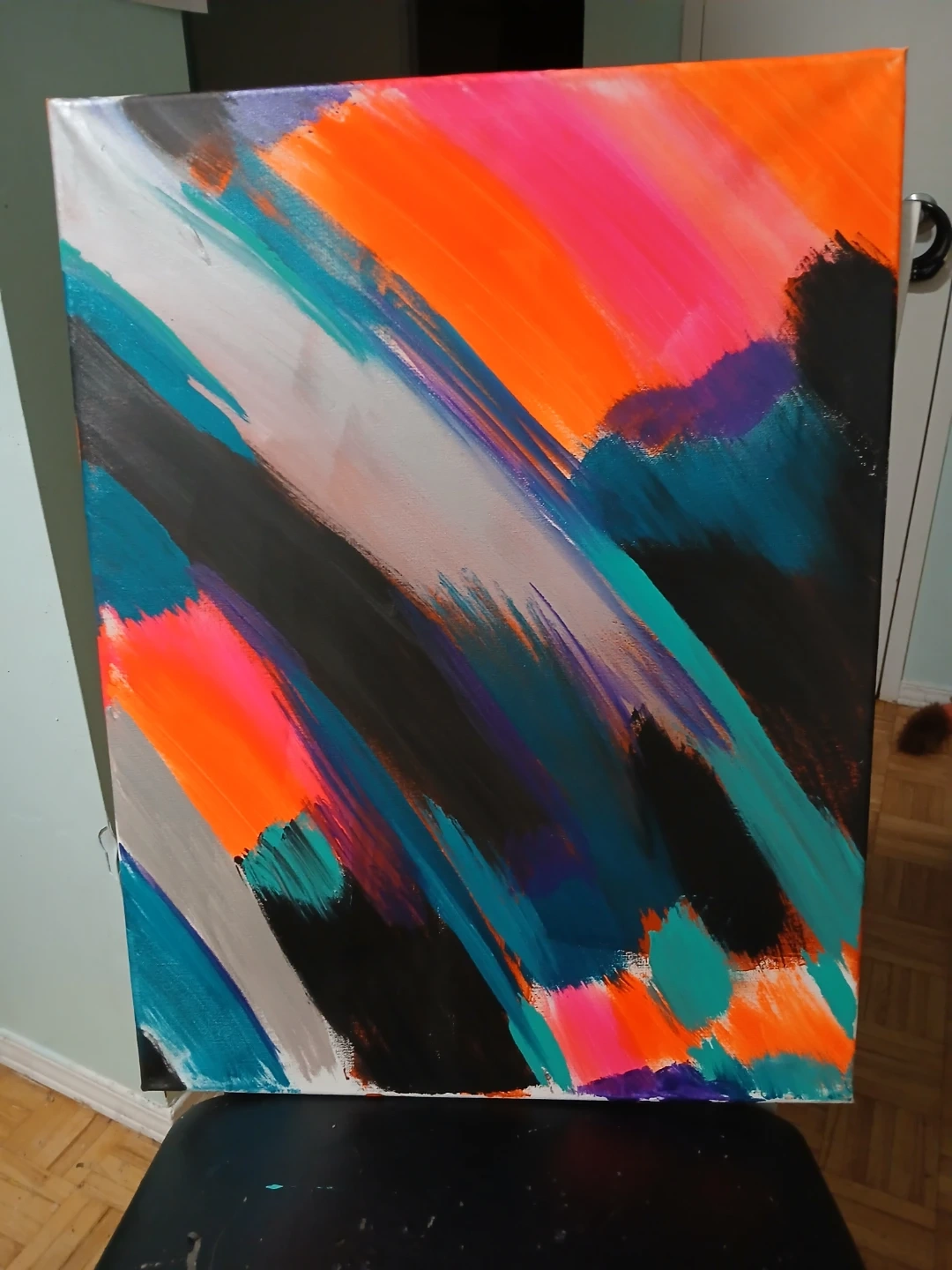 Canvas painting with vibrant abstract brushstrokes. Colours include orange, pink, teal, black, and grey. It's a lively addition to any space!