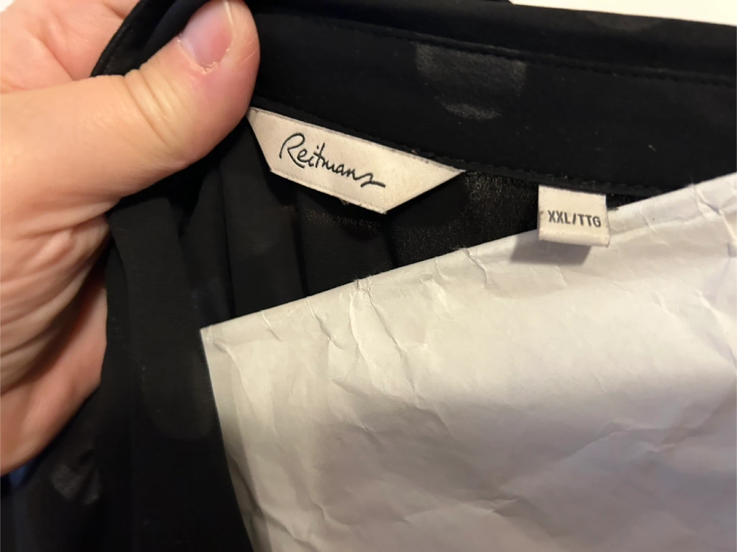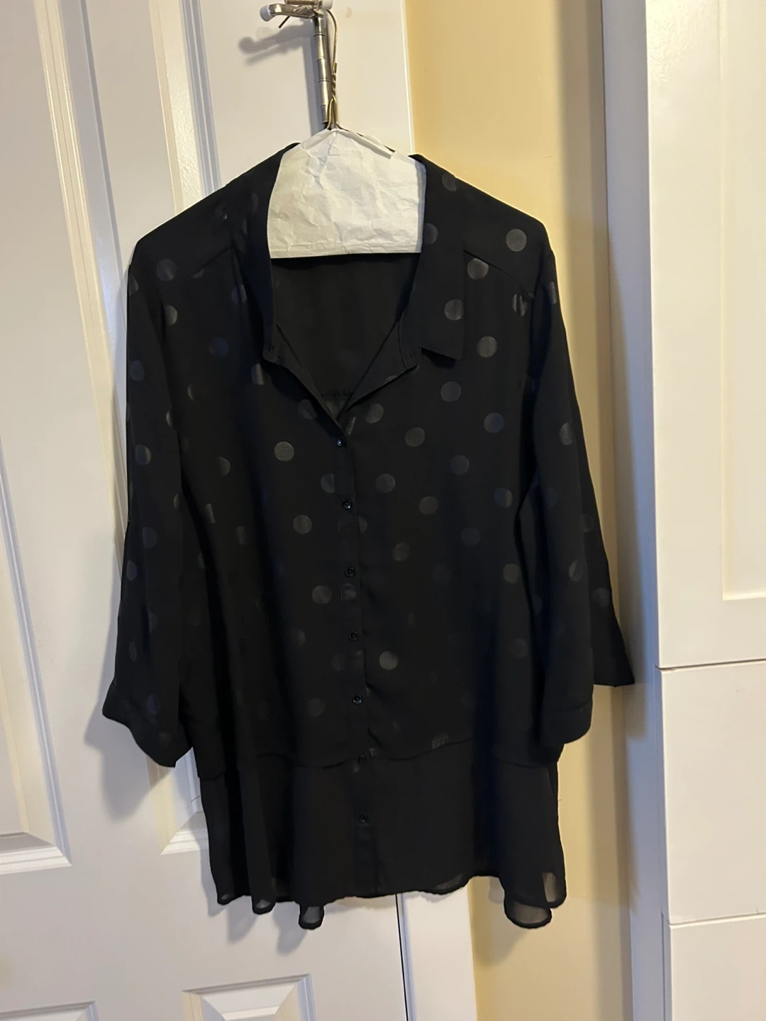 This is a Reitmans black blouse with a subtle polka dot design. It features a button-up front and a collared neckline. The material is lightweight and flowy. Size XXL.