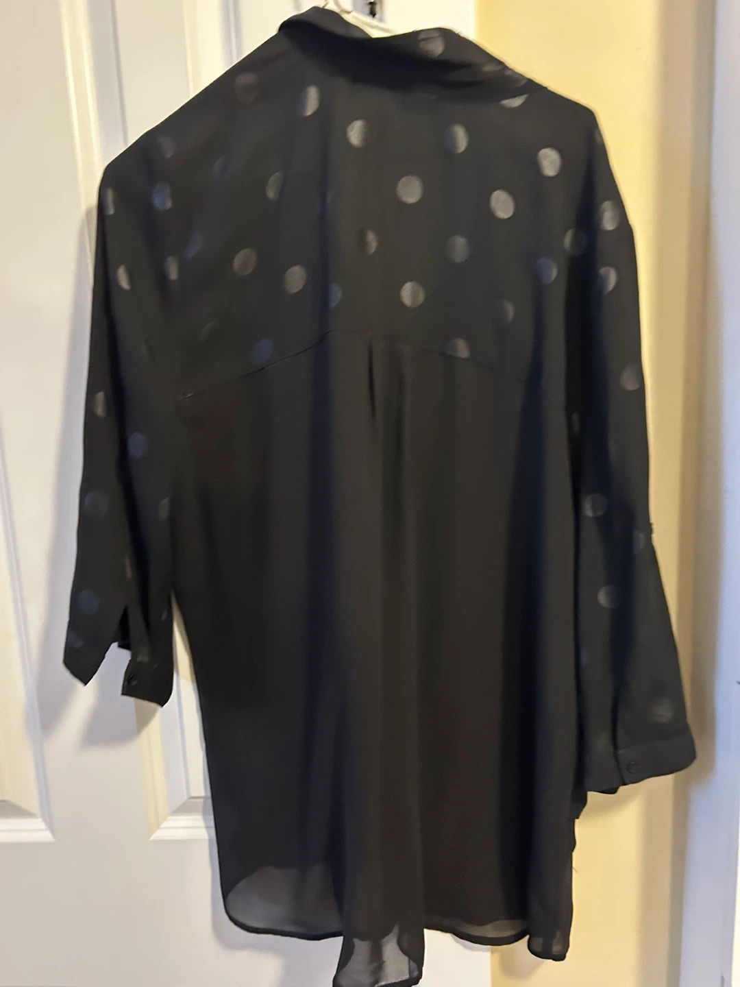 This is a Reitmans black blouse with a subtle polka dot design. It features a button-up front and a collared neckline. The material is lightweight and flowy. Size XXL.