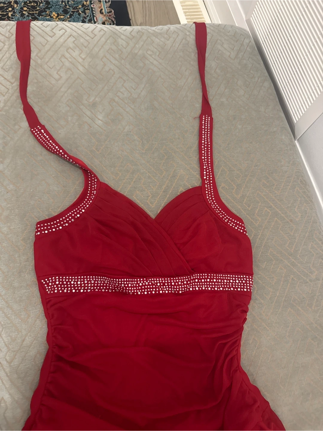 Flowy red maxi dress with a flattering ruched bodice. It's detailed with sparkling rhinestones along the neckline and waistline. Perfect for a special occasion!