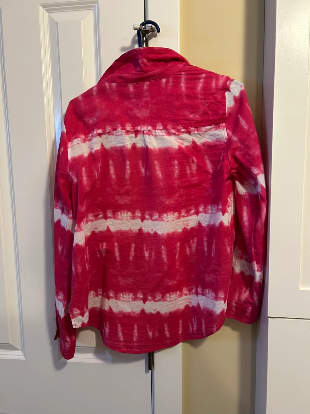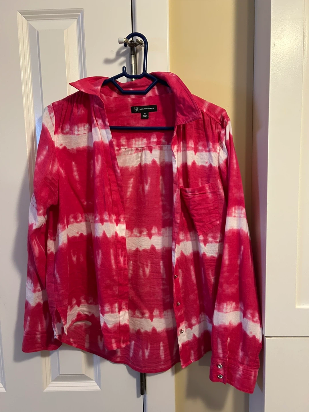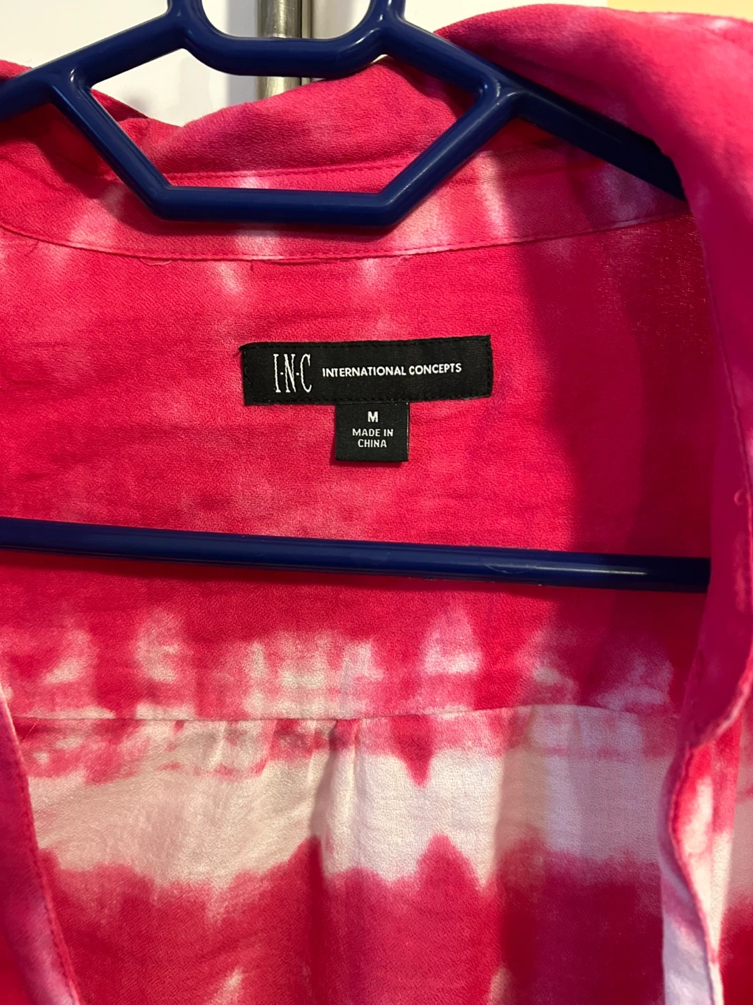 This is an INC International Concepts button-up shirt with a pink and white tie-dye pattern. It's a size medium. The shirt has a classic collar and long sleeves with button cuffs.