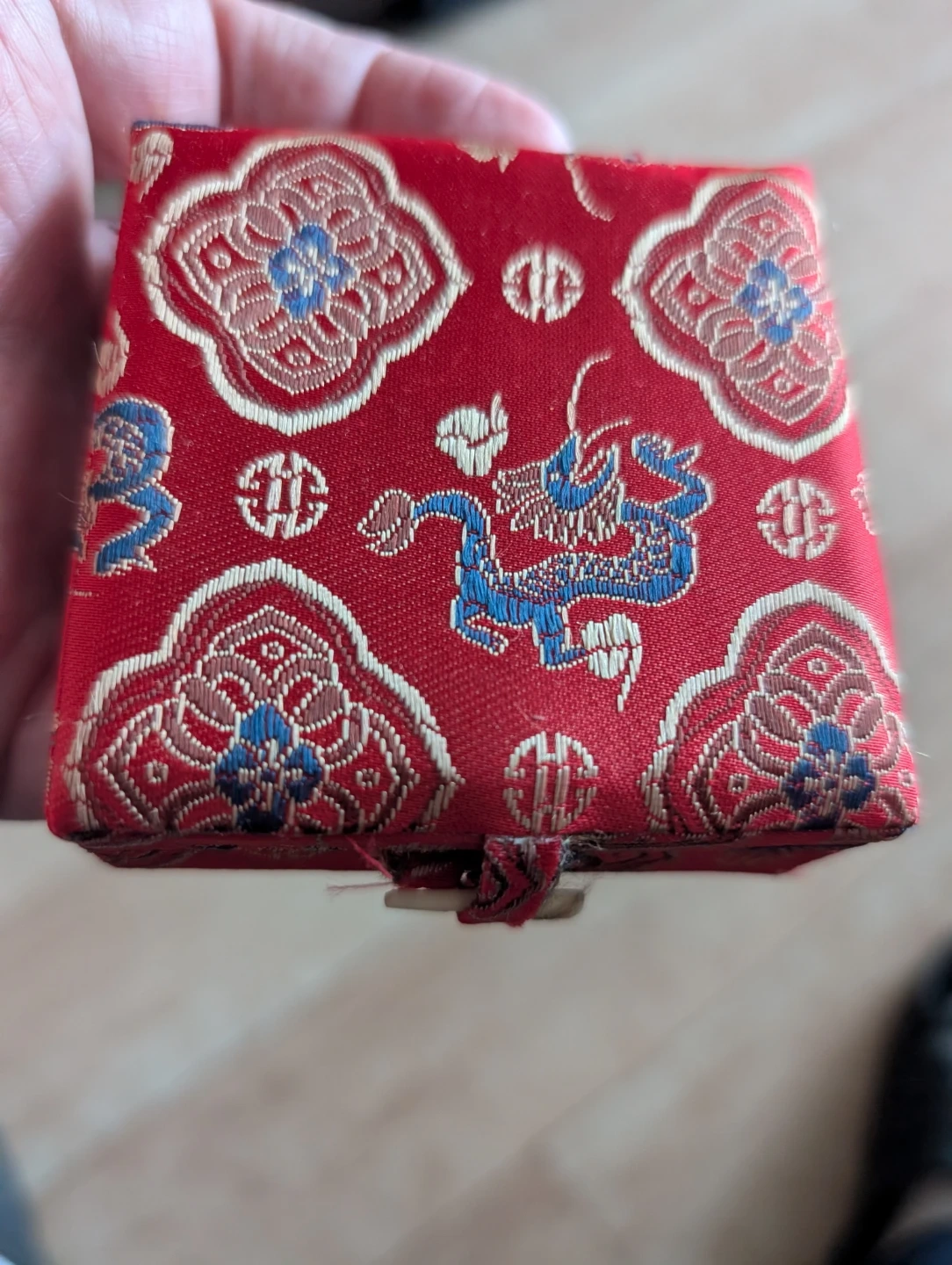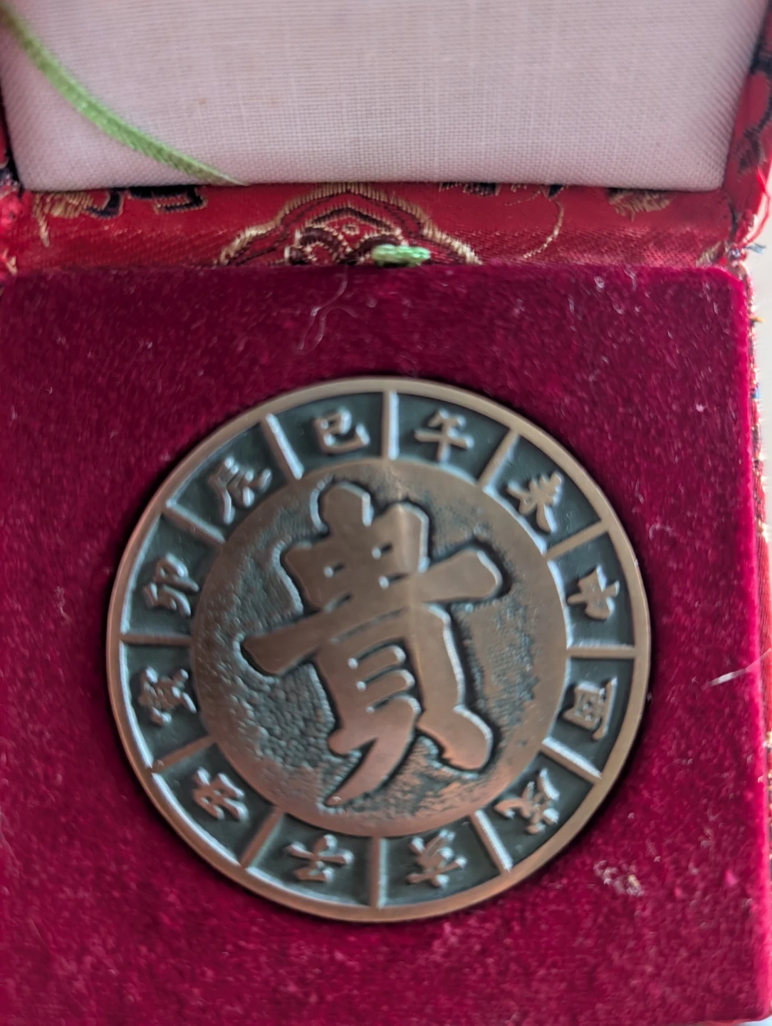 Commemorative Chinese Zodiac Medallion from Beijing, China. Features intricate detailing with a year of the dragon design. Comes in a velvet-lined presentation box and is covered in a satin silk brocade fabric featuring traditional Chinese patterns including blue and gold dragons, along with auspicious symbols and floral designs.