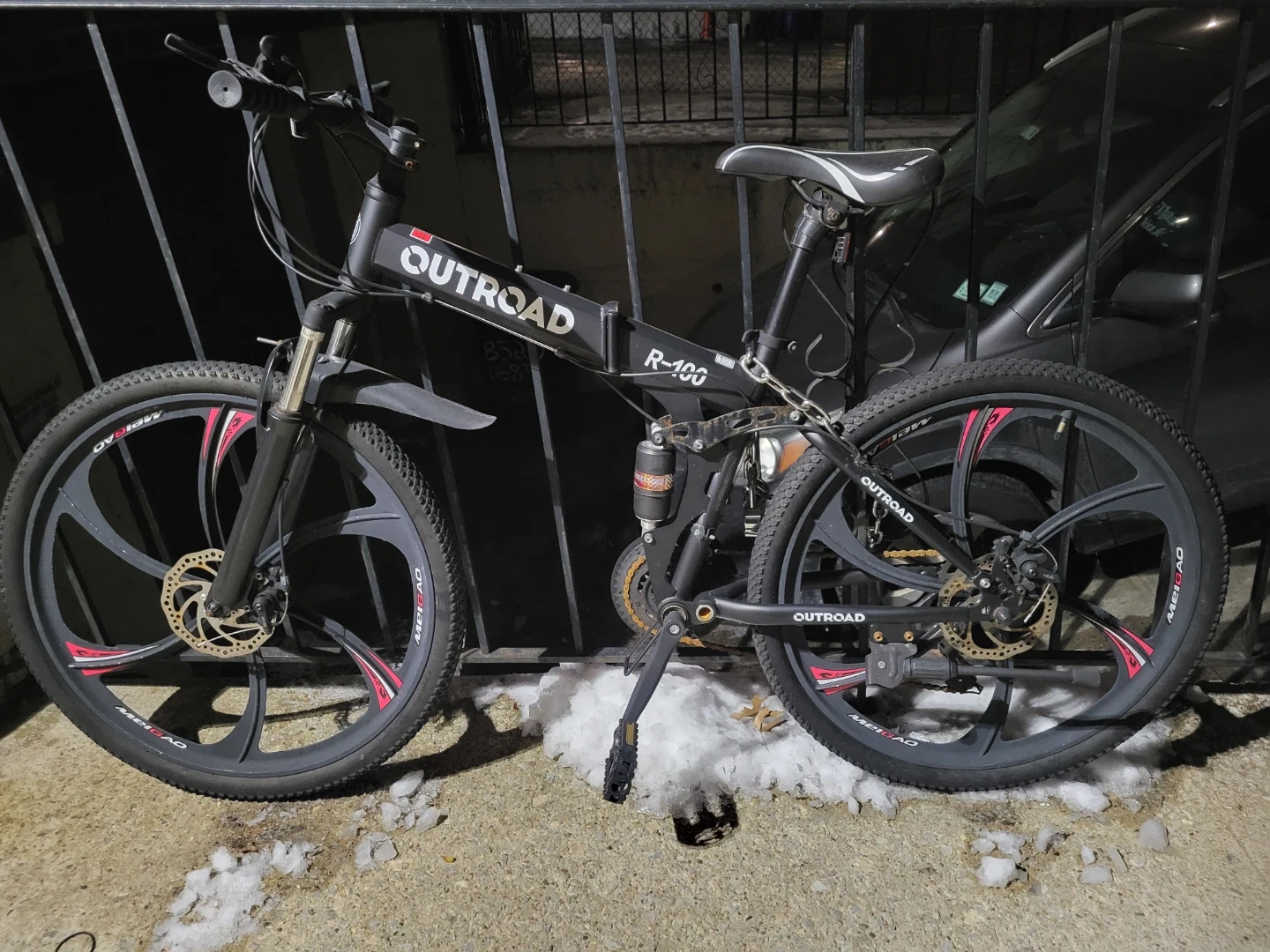 This is a black OUTROAD R-100 folding mountain bike. It features dual disc brakes and a suspension system. The bike is designed for off-road trails. It's a great option for commuting or recreational riding!