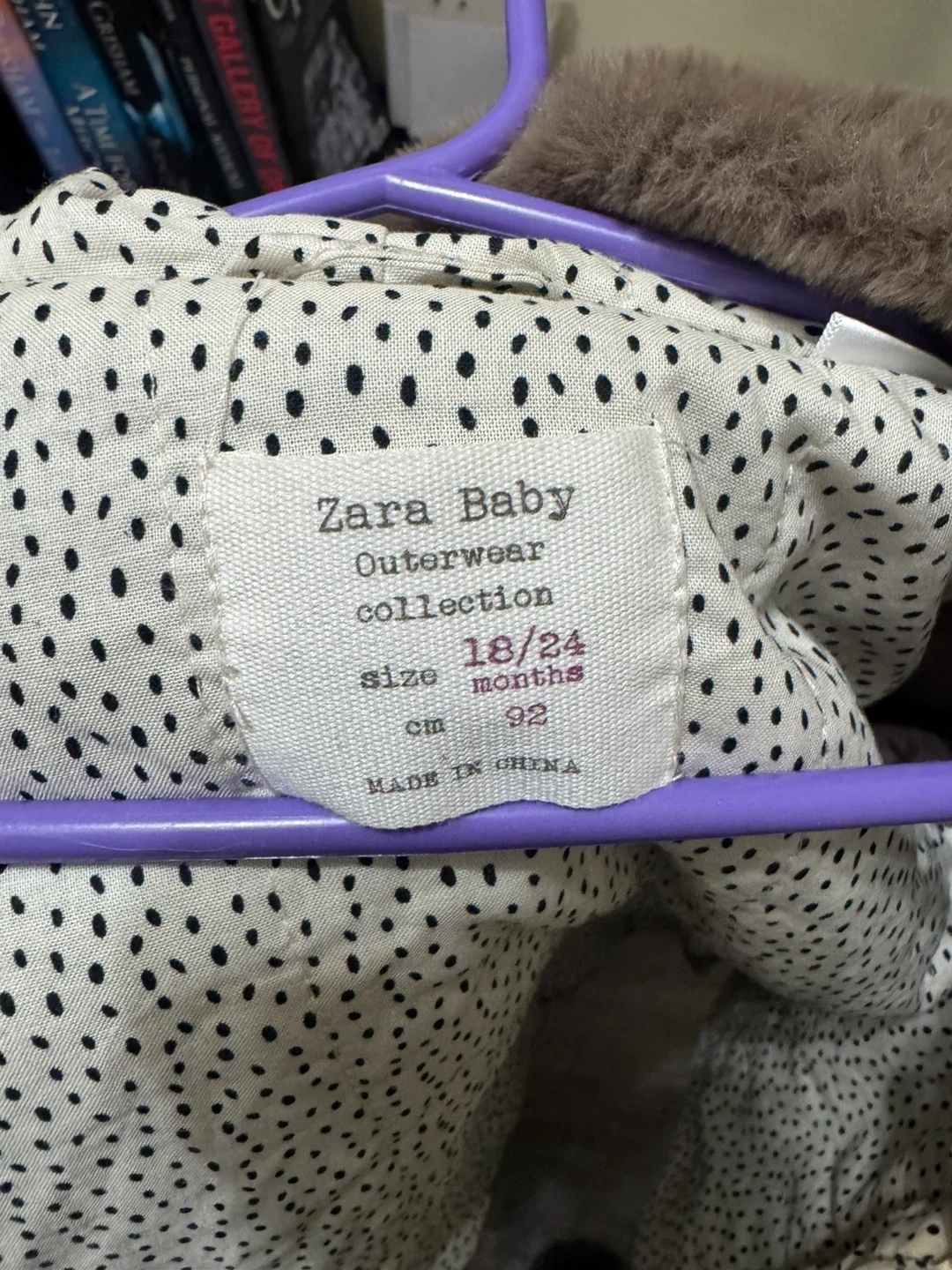 Cute and cozy brown faux fur jacket from Zara Baby's outerwear collection. It features a playful fox face design on the hood with a pom-pom detail. Fully lined with a black and white polka dot pattern and has two front pockets. Size 18/24 months, made in China. Perfect for keeping your little one warm and stylish!