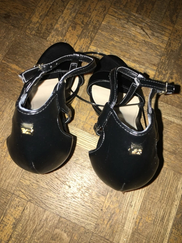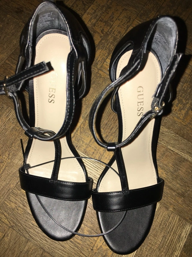 Step out in style with these Guess black heels, size 9. These sleek heels feature a T-strap design and a slender heel, perfect for dressing up any outfit. These shoes are in used condition. Brand: Guess, Colour: Black, Size: 9, Style: Heel. Pricing these at $20. If you're seeing this ad, the heels are available and ready to elevate your wardrobe!
