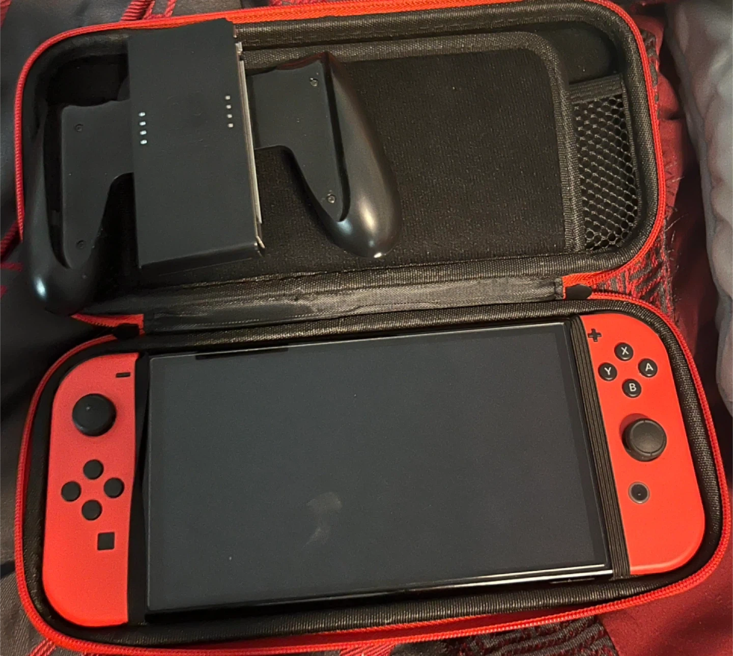 This is a Nintendo Switch Oled with red Joy-Con controllers. It includes a charging grip for added convenience. It's all stored in a protective red and black carrying case. It’s only a year old and good as new.