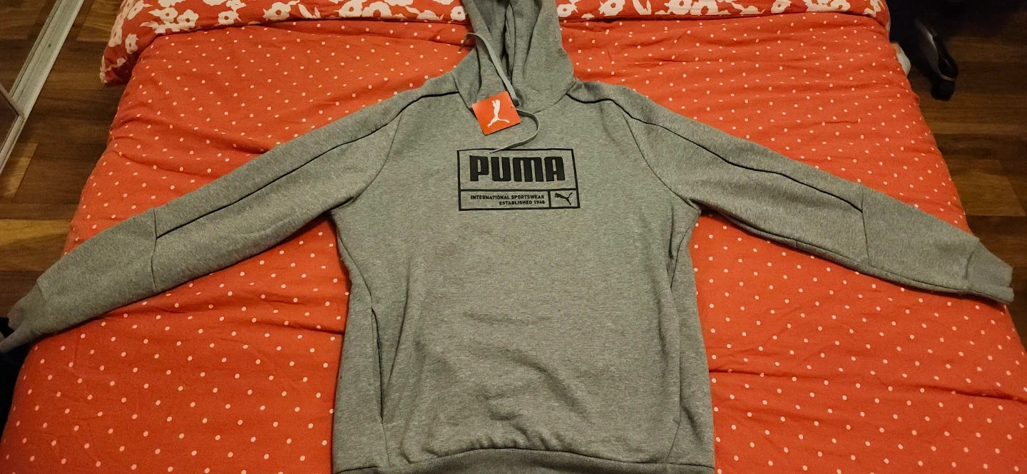 Puma hooded sweatshirt in heather grey. It's a size medium and features the Puma International Sportswear logo. A comfortable hoodie for everyday wear!