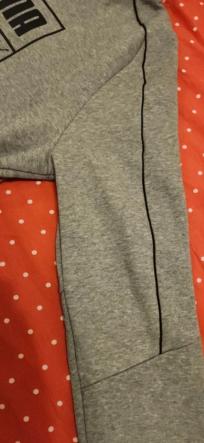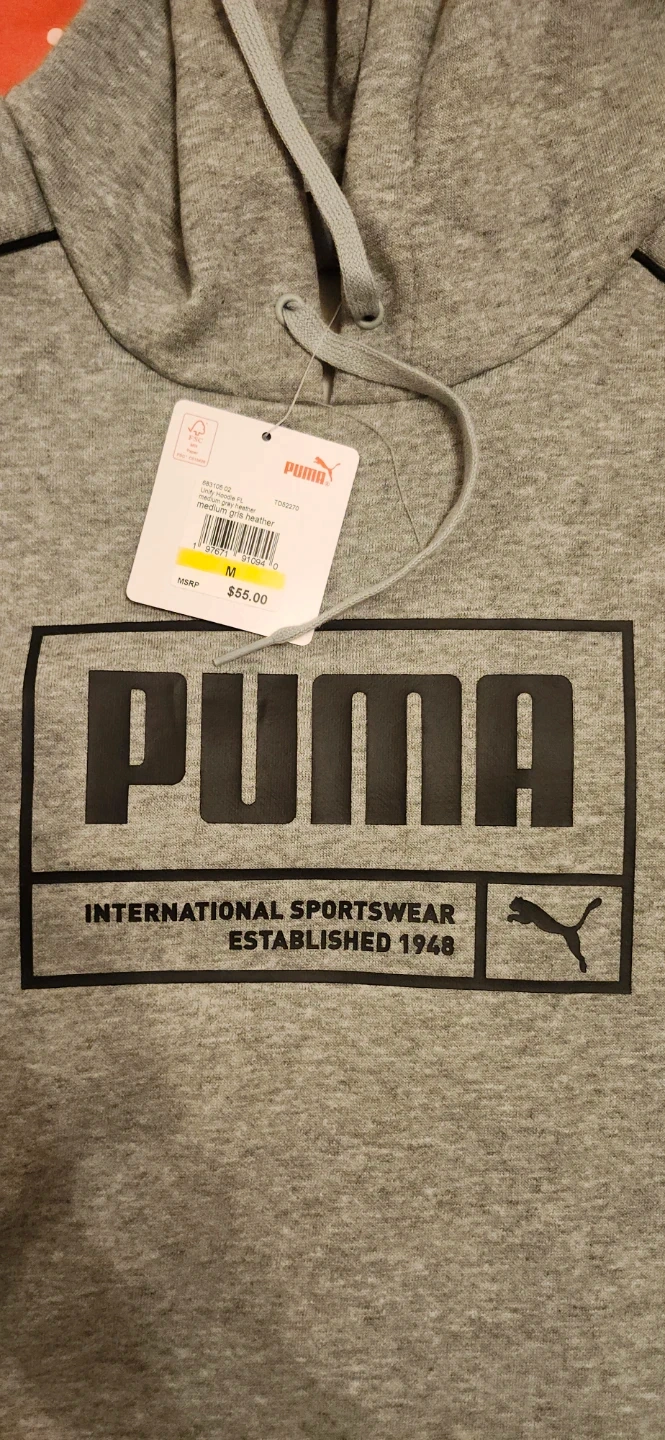 Puma hooded sweatshirt in heather grey. It's a size medium and features the Puma International Sportswear logo. A comfortable hoodie for everyday wear!