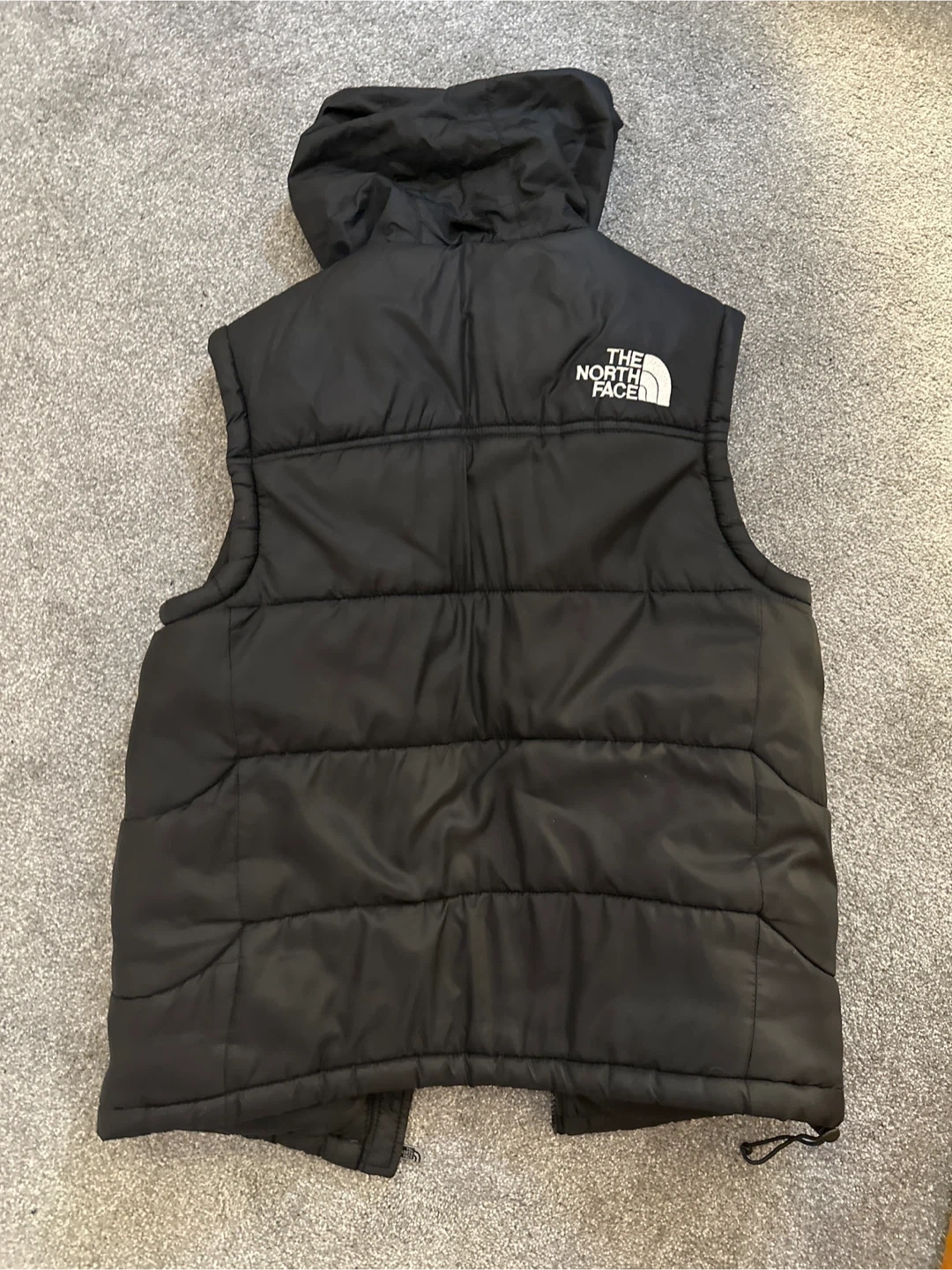 A black puffer vest from The North Face. It's filled with insulation for warmth. This vest is ideal for layering during cooler weather.trade also work
