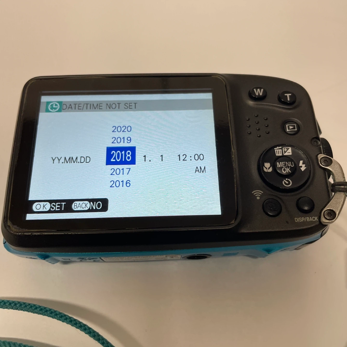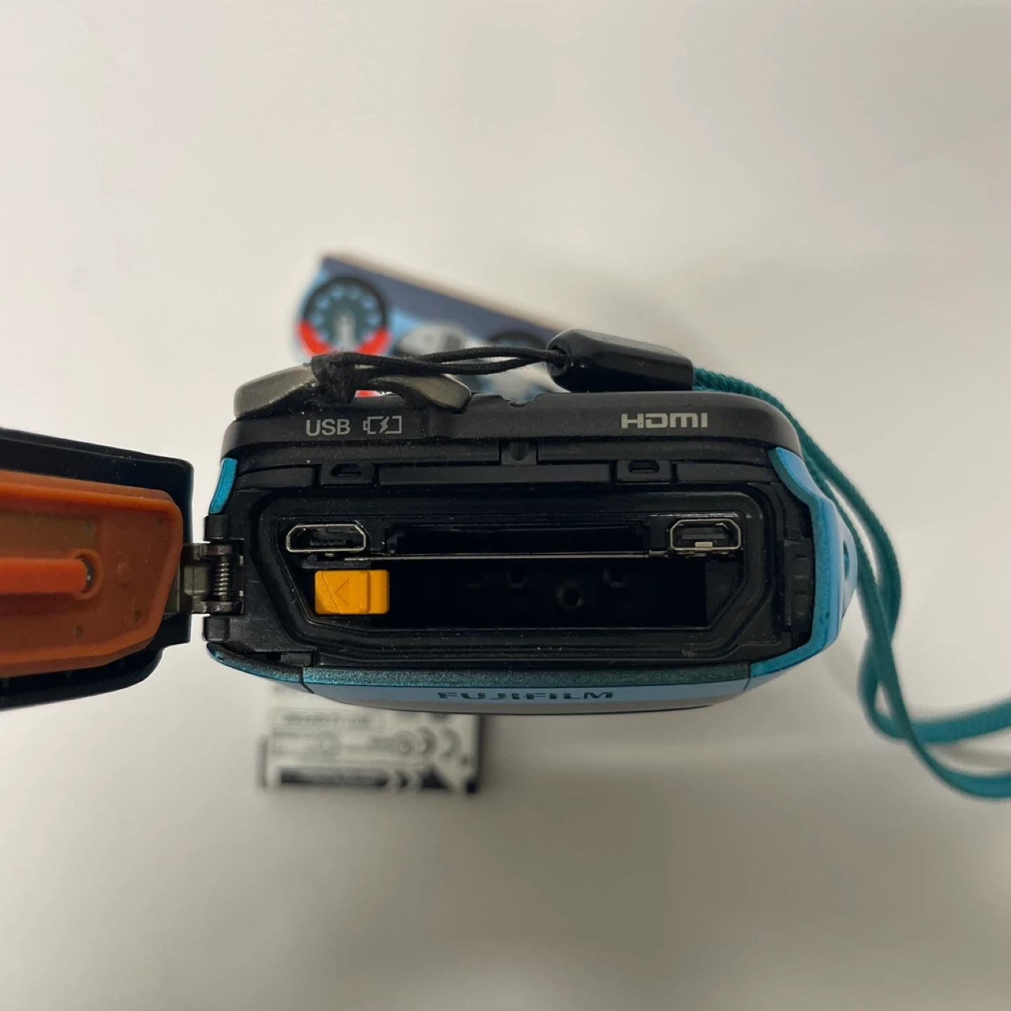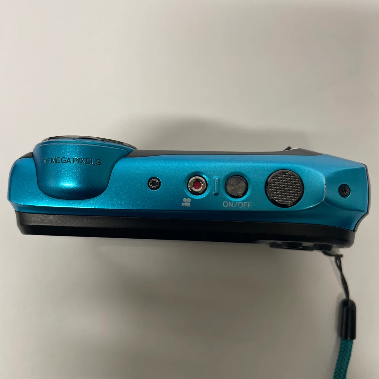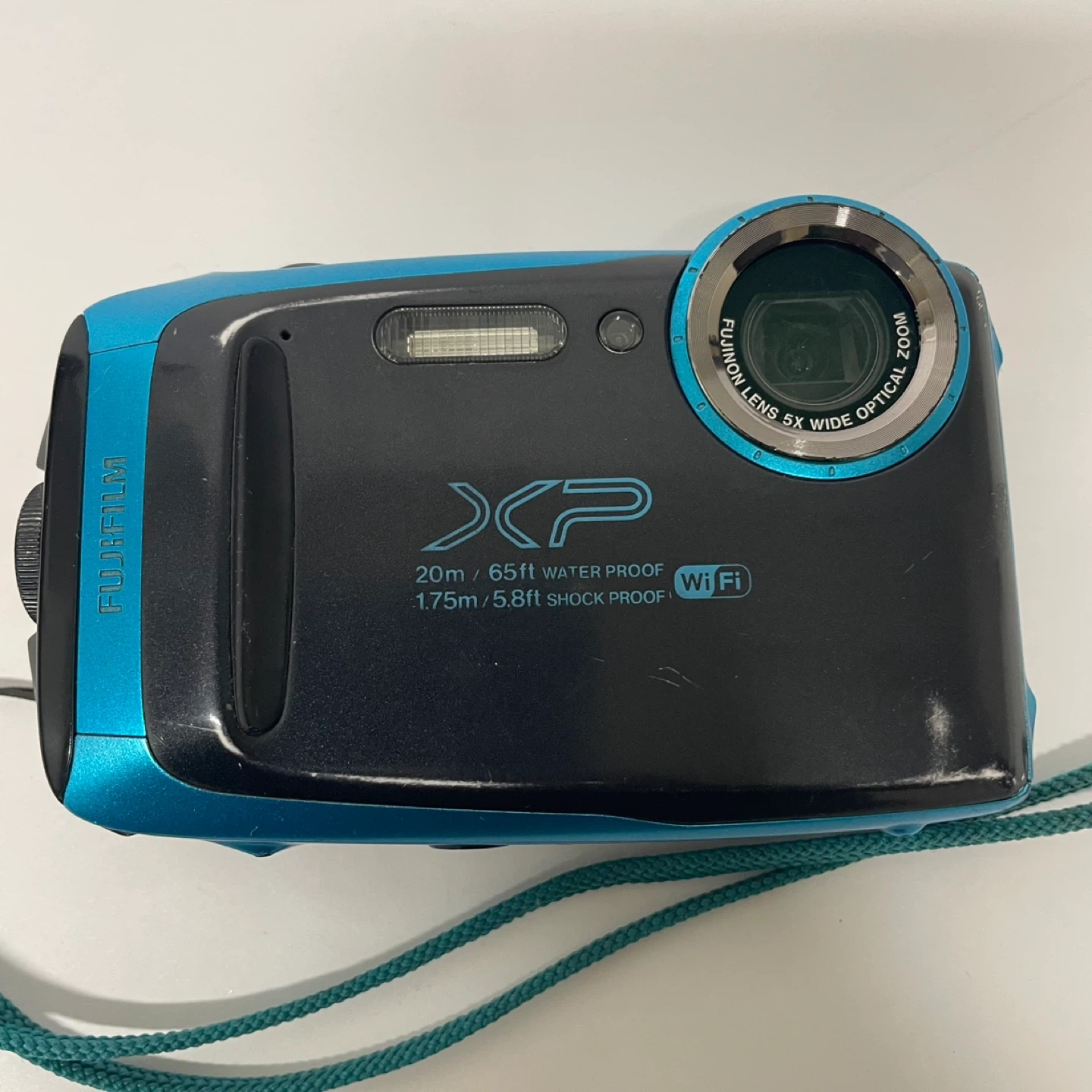 This Fujifilm digital camera is blue and waterproof up to 20m/65ft. It has a 16-megapixel sensor and 5x optical zoom. The camera is shockproof from 1.75m/5.8ft.