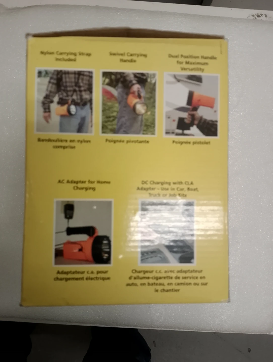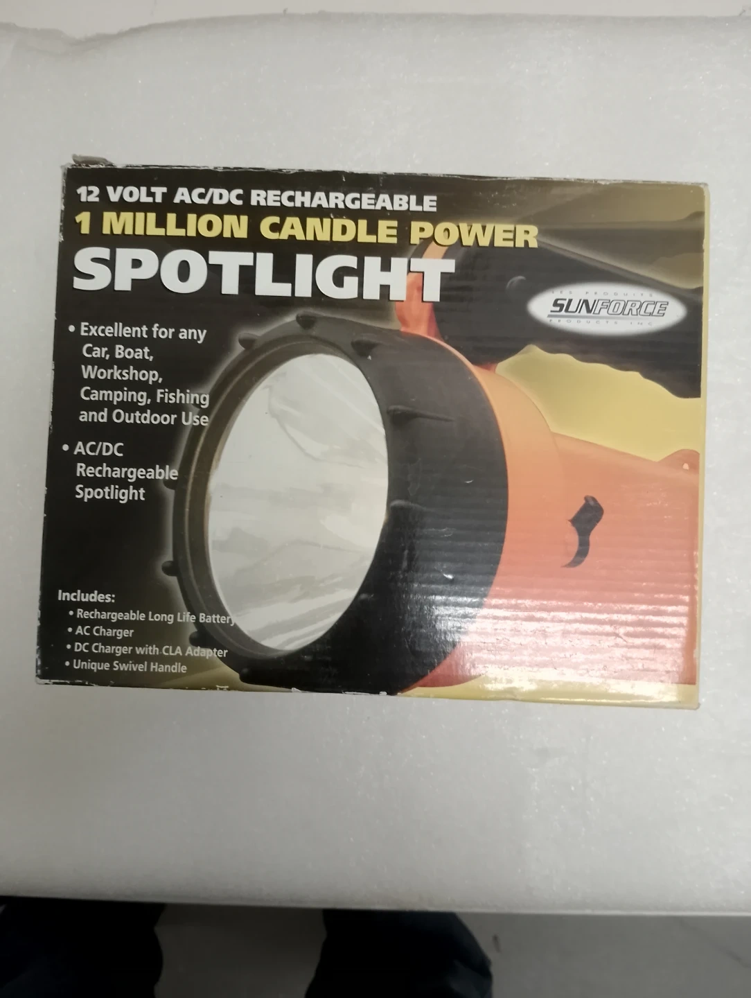 This is a 12 volt AC/DC rechargeable spotlight. It offers 1 million candle power and includes a rechargeable long life battery, AC charger, and DC charger with CLA adapter. It features a unique swivel handle.